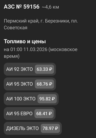 ООО «ЛУКОЙЛ-Уралнефтепродукт» (11.03.2026г.) 100 ЭКТО 95,82 ₽; +0,25р 95 ЭКТО 68,76 ₽; +0,25р 95 ЕВРО 68,41 ₽; +0,25р 92 ЭКТО 63,33 ₽; +0,25р ДТ ЭКТО 78,97 ₽. +0,15р