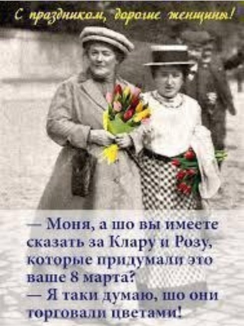 Скромно, очень скромно. А как же Роза Люксембург и Александра Коллонтай? А где весеннее настроение, где мимоза, где тортики? Зачем нам каска, сковородка, еще дрель припишите, а нет пилу, ага, электрическую, лобзик) Ну что , девчонки! С праздником нас, прекрасных фей, очаровательных, привлекательных, харизматичных и симпатичных! В этот день нам можно все, вино, кино, и казино… Балет, омлет, тугой корсет… Стриптиз, круиз, любой каприз… А вам мужчины лишь молчать, посуду мыть и не ворчать!