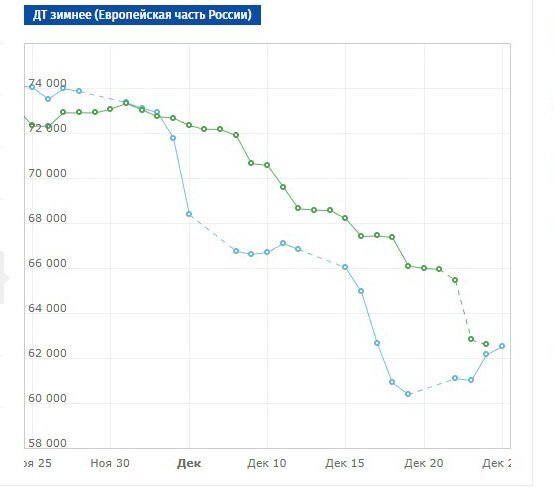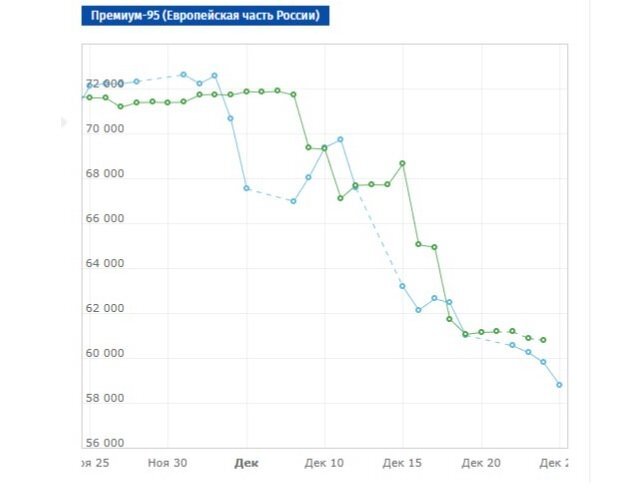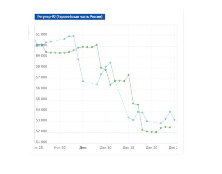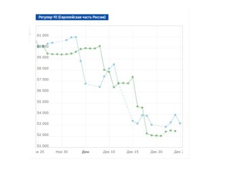 В Пермском крае с 16 по 22 декабря средняя стоимость бензина составила 63,7 руб. за литр, что на 7 коп. меньше, чем неделей ранее. Такие данные публикует Росстат. Цена бензина АИ-95 за отчетный период снизилась до 65,77 руб. за литр, что на 6 коп. меньше прошлых показателей. Бензин марки АИ-92 подешевел на 9 коп. — до 60,63 руб. за литр. В то же время цена бензина АИ-98 увеличилась. Его стоимость выросла на 21 коп. и составила 90,03 руб. за литр. Рост также был зафиксирован по дизельному топливу — его цена увеличилась на 12 коп., до 76 руб. за литр. Согласно статистике, с 16 по 22 декабря снижение цен на автомобильный бензин зафиксировали в 39 регионах России. Наиболее заметное удешевление отмечено в Республике Тыва и Ингушетии — на 1,4%. Рост цен за тот же период зарегистрирован в 12 субъектах РФ, максимальный — в Костромской области (+0,5%). В Москве и Санкт-Петербурге стоимость автомобильного бензина за неделю увеличилась на 0,1%. https://perm.rbc.ru/perm/freenews/694c1f639a794745ef1f63ce АИ-92 39,6094 руб/литр АИ-95 44,4008 руб/литр ДТ зим 51,58 руб/литр https://spimex.com/ Графики для наглядности. Кто сделает график снижения цены по заправкам?)