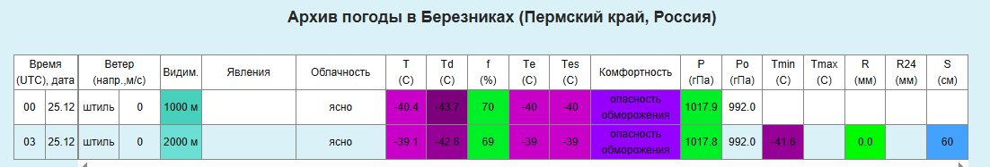 Сегодня ночью область самых низких температур сместилась с севера на центральные и восточные районы Пермского края и север Свердловской области. В Березниках, Чермозе и Губахе минимумы оказались ниже -40°С – холоднее чем в Чердыни В Перми минимум на 08.00 местного времени -35,6°С – это самая низкая температура на городской метеостанции с 9 января 2017 г. В Ивдели на севере Свердловской области -43.9°С – это самое низкое значение с 15 декабря 2009 г. Окончательные значения минимумов станут известны после 11.00