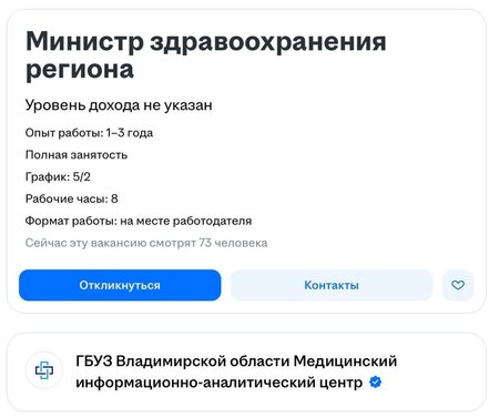 Министра здравоохранения во Владимирской области ищут через HeadHunter. Во Владимирской области вакансию министра здравоохранения разместили на сайте HeadHunter. Формат — как у обычной работы: полная занятость, график 5/2, восемь часов в день. Зарплату, правда, решили не указывать. В описании всё серьёзно: будущему министру предстоит разрабатывать госполитику в сфере здравоохранения, координировать работу медучреждений, следить за качеством медуслуг, анализировать состояние здоровья населения и контролировать бюджет. Требования тоже стандартные — высшее образование, минимум четыре года госслужбы, знание профильного законодательства, стратегическое мышление и аналитические способности. == Fox News Russia Есть желающие?
