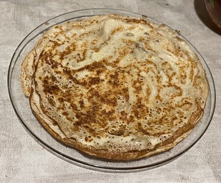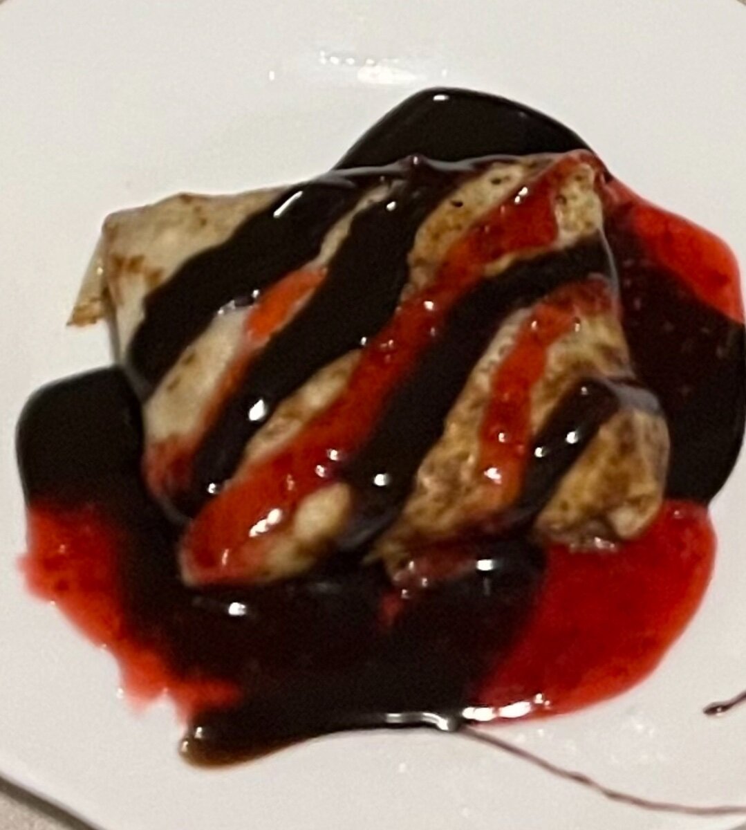 Главное блины! Купила топпинги шоколадный и малиновый. Внутрь банан, сверху вкусняшка! Бабушка сделала еще блины с зеленым луком и творогом, но я это уже не осилила.