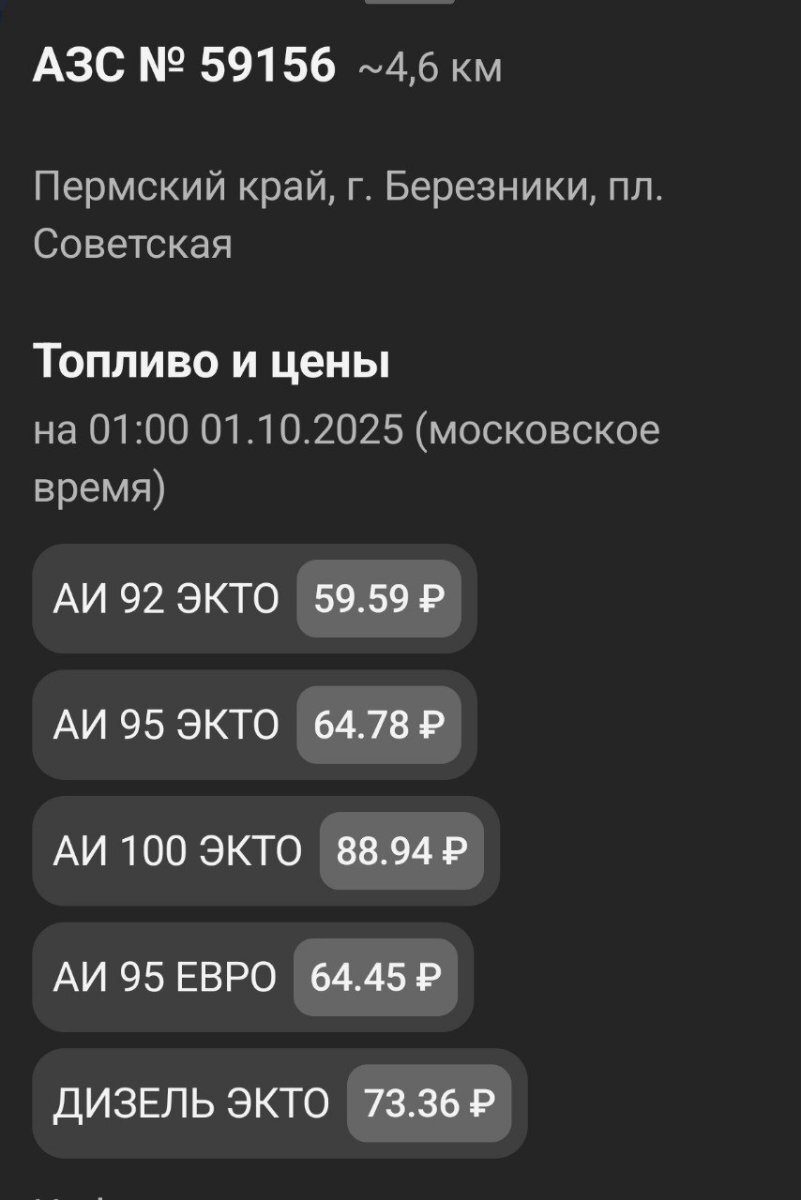 ООО «ЛУКОЙЛ-Уралнефтепродукт» (01.10.2025г.) +0,30 руб. 100 ЭКТО 88,94 ₽; 95 ЭКТО 64,78 ₽; 95 ЕВРО 64,45 ₽; 92 ЭКТО 59,59 ₽; ДТ ЭКТО 73,36 ₽.