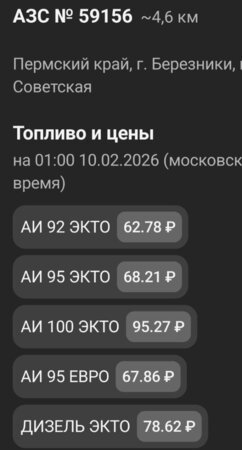 ООО «ЛУКОЙЛ-Уралнефтепродукт» (10.02.2026г.) 100 ЭКТО 95,27 ₽; 95 ЭКТО 68,21 ₽; 95 ЕВРО 67,86 ₽; 92 ЭКТО 62,78 ₽; ДТ ЭКТО 78,62 ₽.