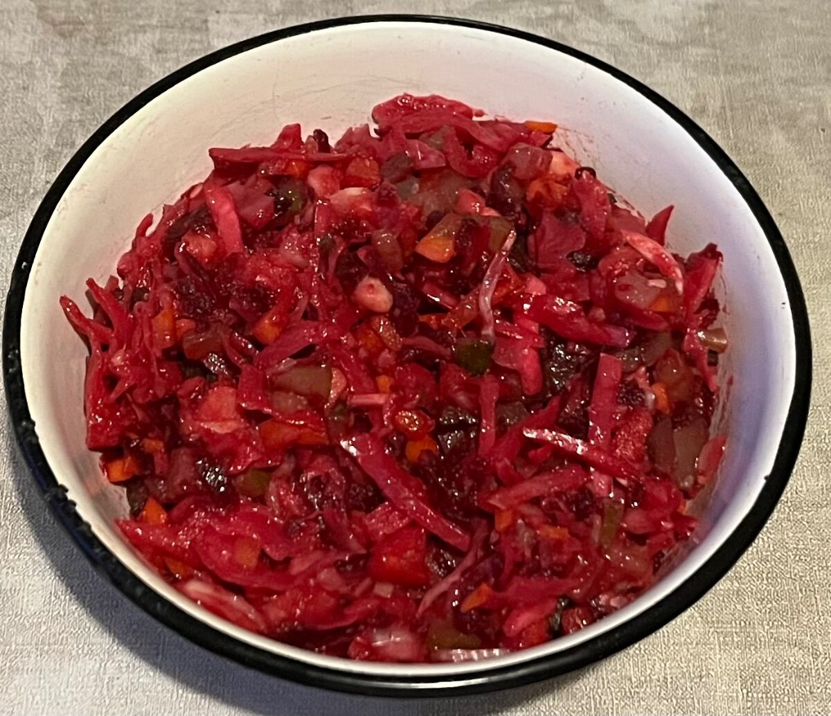 Модернизированный винегрет. Капу ста маринованная, огурцы хрустящие по-фински, маслА подсолнечное не рафинированное и оливковое салатное. Получилось очень даже вкусно. Иностранц