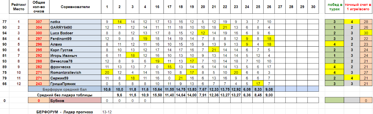 2. российский футбол...тур закончен) у нас два сногсшибательных победителя Ferdinant99 и Алвиз! Искренние поздравления! Вы невероятны! ну а 27 тур стартует послезавтра, в субботу, 25 апреля))) все варианты написала))) прогноз доступен