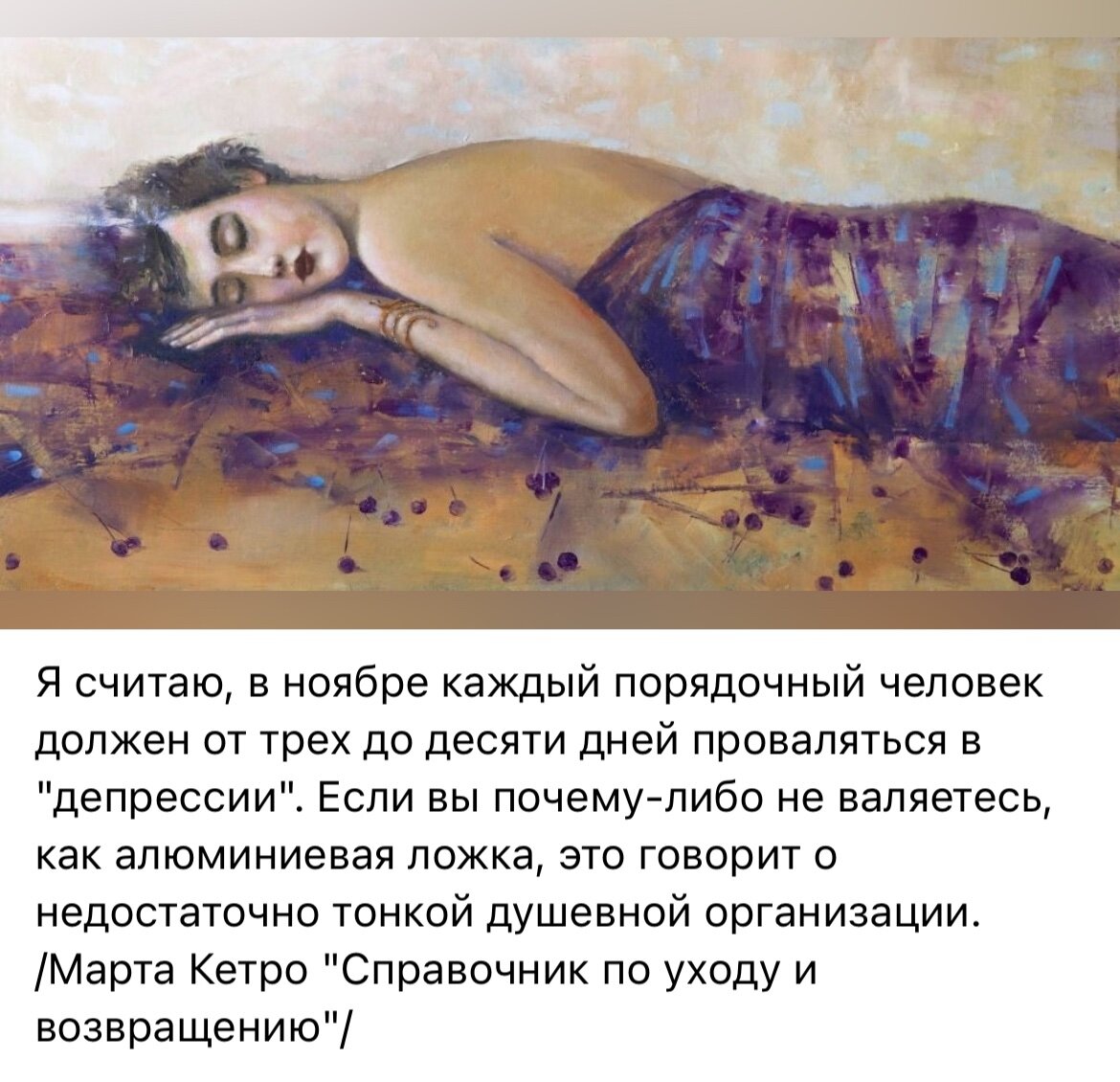 16. Я думаю чего это настроения нет, приближение Нового года не чувствуется, отказалась с дурума от выходных с 1-10 января, решила в Москву не лететь, ниахото! Вообще кроме любимого дивана ничего не хоцца. Думаю может витамина д не хватает, магния добавить для огоньку в душе, аминокислот по принимать, ан нет, фигвам! Тонкая душевная организация у меня оказывается! Спасибо интернету, сказал что все нормально! Пройдет! Полежу, помечтаю своим шизоидным типом организации мысли, от 3 до 10 дней и ффсе будет прекрасно! Так хоцца бросить все и в Париж)))))))блин двести тыщ жалко на Париж, а может и того дороже. Странно, на слух не понимаю, а на бумаге стала понимать французский язык. Читаю легко. Может я в другой жизни жила во Франции?! Точно! Я же забыла! Мне расклад на прошлую жизнь делали, Дэк я оказывается была богата, жила во Франции и меня обманули и украли мое бохатсво. Чего-то такое я помню , нужно поискать где этот бред у меня лежит, перечитать. Опять таки перечитаю, опять расстроюсь, что меня обманули в прошлой жизни . Ну нафиг! Пойти штоли шкаф переставить с книгами. Заботушка-работушка она в чуйство приводит и шизоидов тоже. А то тут недавно мне кошка моя умершая привидилась в темноте, смотрю идет сиамка моя, проскользнула и нет ее, поморгала поморгала я три раза плюнула и дальше пошла по коридору. Свет надо зажигать, нефиг в темноте ходить. А с другой стороны экономить надоть. Щас лепестричество дорогое! Маман выселила к себе, Дэк за воду в два раза меньше плачу. Она все посуду мыла да мыла каждую тарелку сразу как поест. Я ей говорю не мой, щас в посудомойку все поставлю, нет она моет да моет, вот и дохрена воды налила. А ей неймется , делать нефиг, она пельменей настряпала и опять пришла мне все в морозилке забила. Кто их есть будет?! Не успеваю я за бабушкой! Депрессия у меня!
