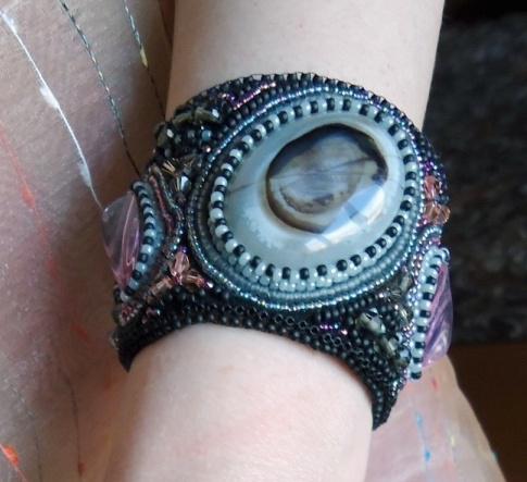 Изумительный большой агат и бусины сложной формы. Вместе они задали сложную цветовую гамму - утренних сумерек - серый с розовым, и одновременно - не серый и не розовый..