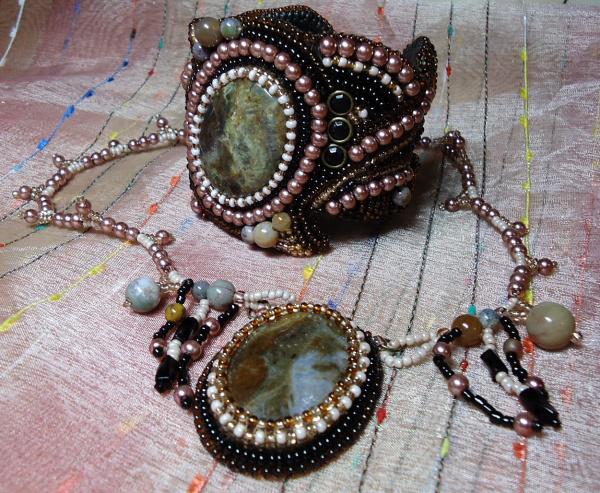 Яшма богатого коричневого рисунка в сочетании с розовым жемчугом, металлической фурнитурой и необычной формой браслета