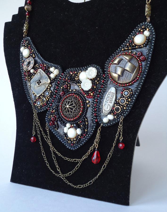 Это сочетание металла-жемчуга-пластмассы и кожи.