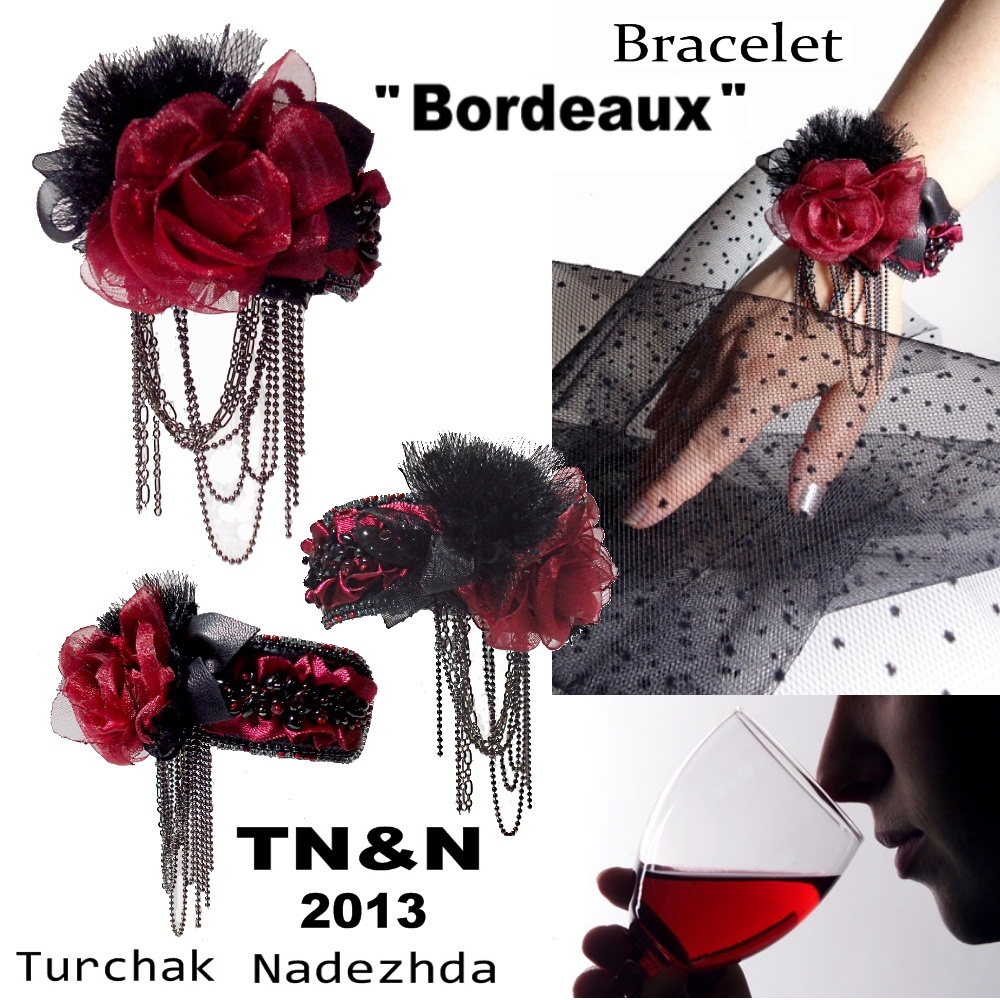 С очаровательной бордовой розой из органзы и пушистым “ежиком” из черной сеточки в горошек. Дополнено атласными лентами, кружевом и бусинами черного агата. http://ya-talantlivaya.ru/bordeaux/