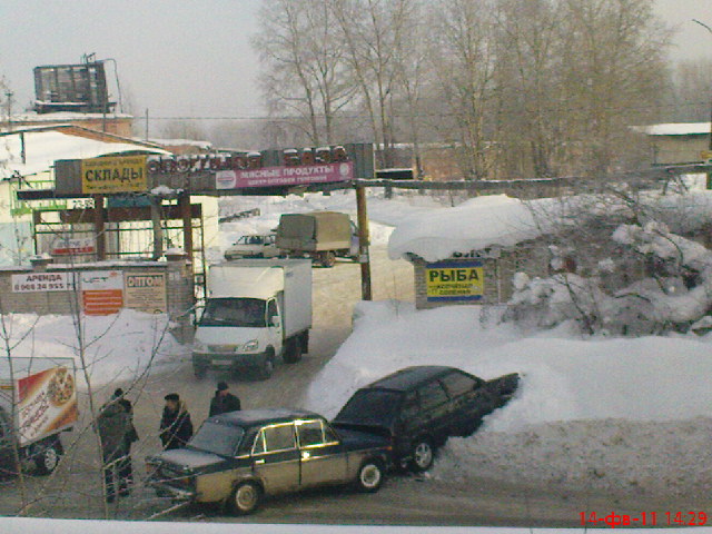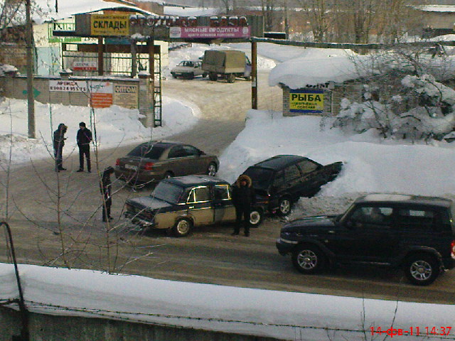 шестерка не является виновной, она пострадала от этой 14ки, шестерка поворачивала в сторону К.Маркса 124, а на 14ке решил в это время в попутном напраление обогнать шестерку, у которой левая бочина в смятку от удара четырки, а 14ку от удара одбросило в сугроб, ну и шоха по инерции ему еще в зад влетела...