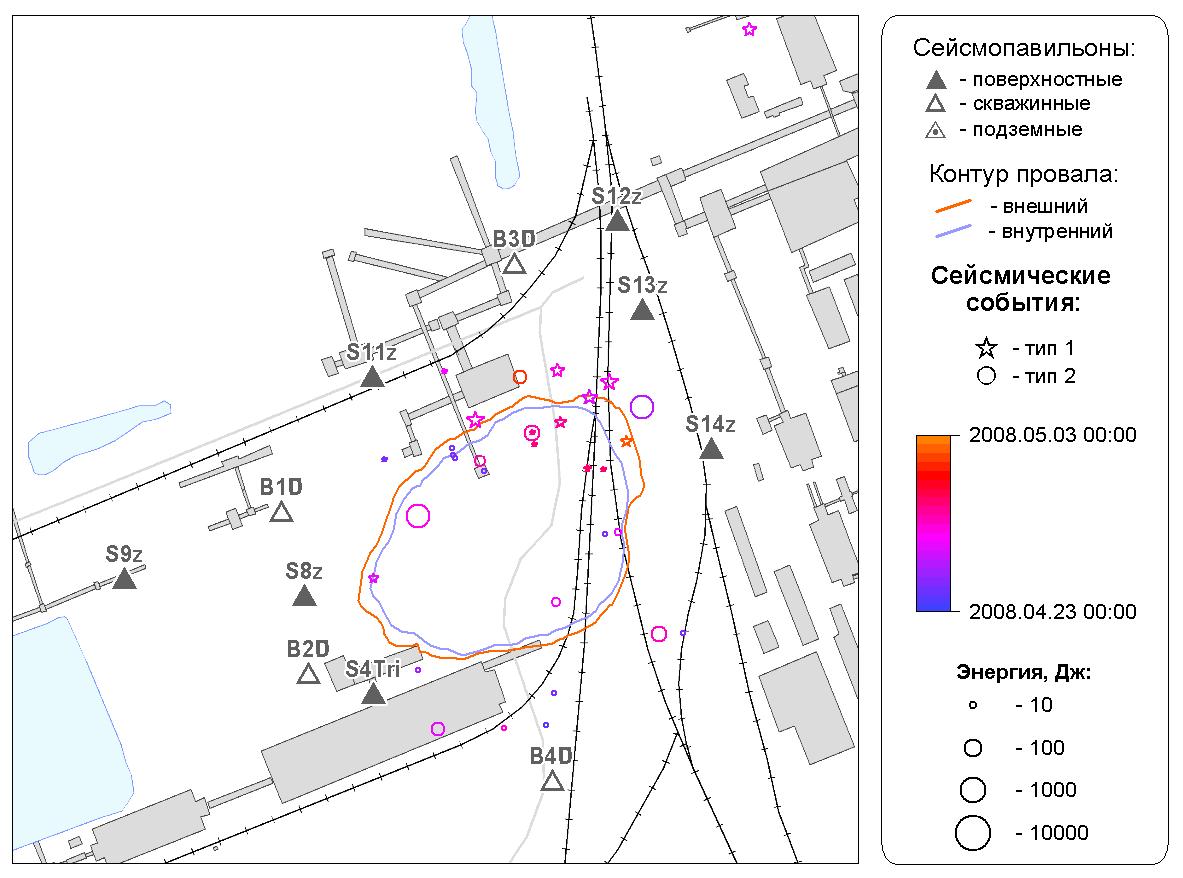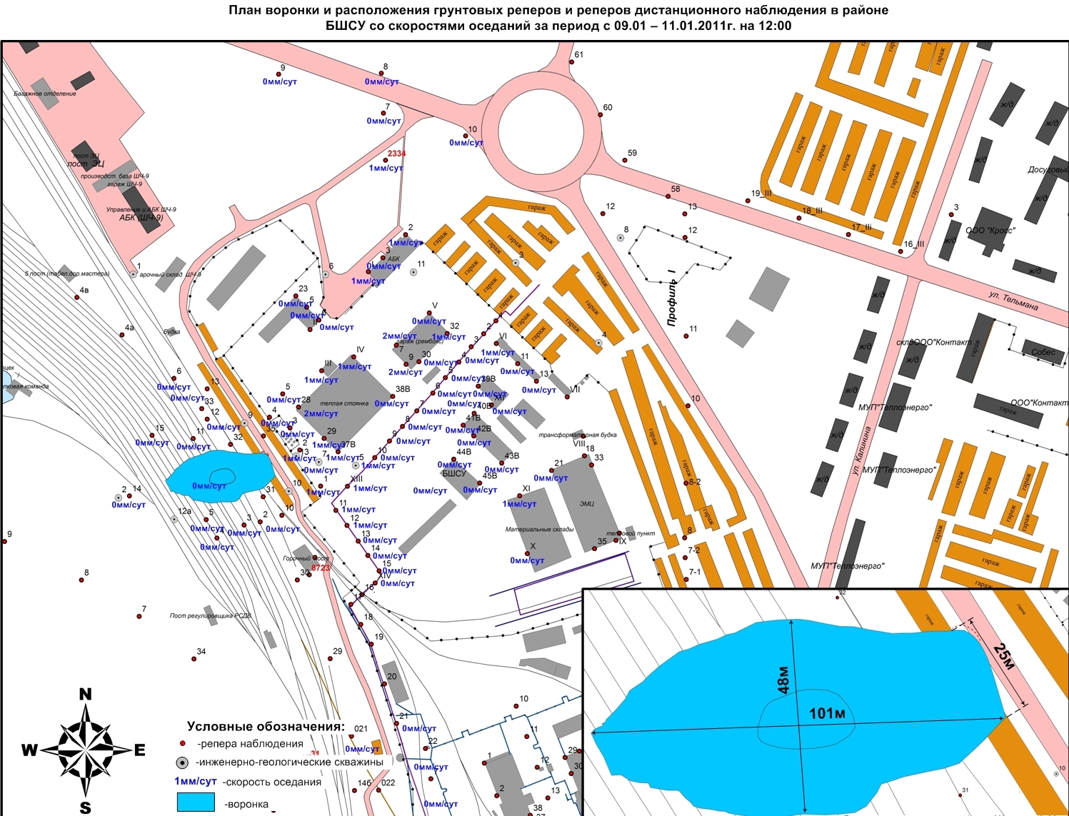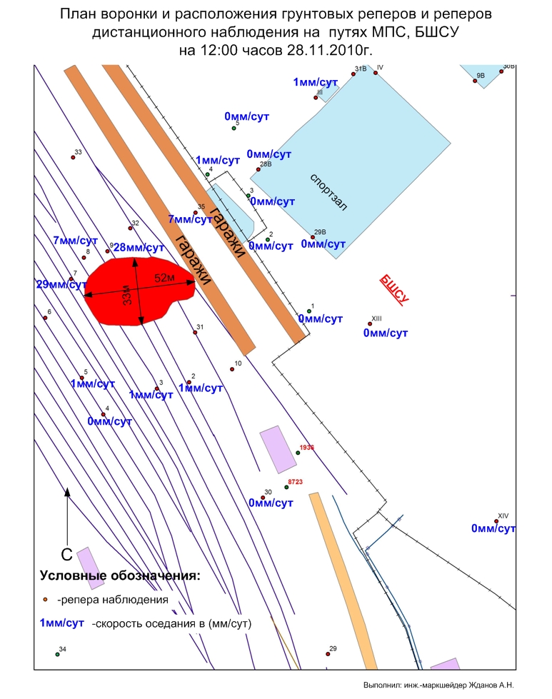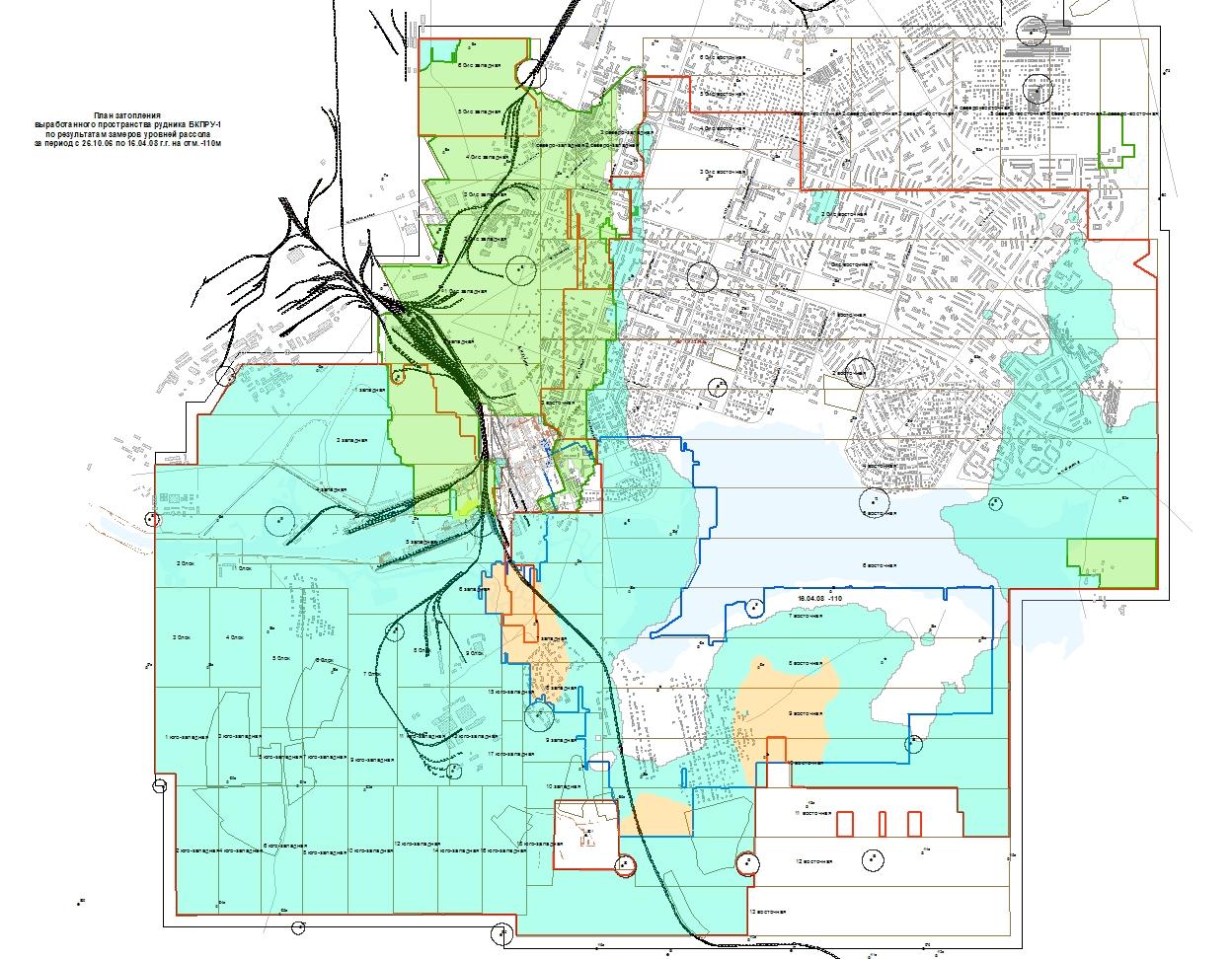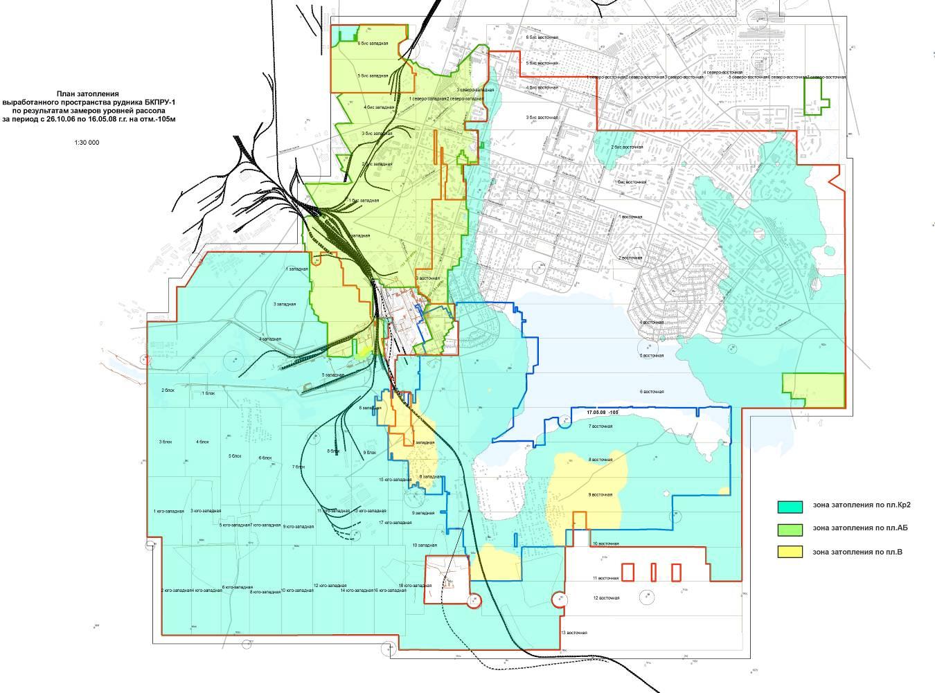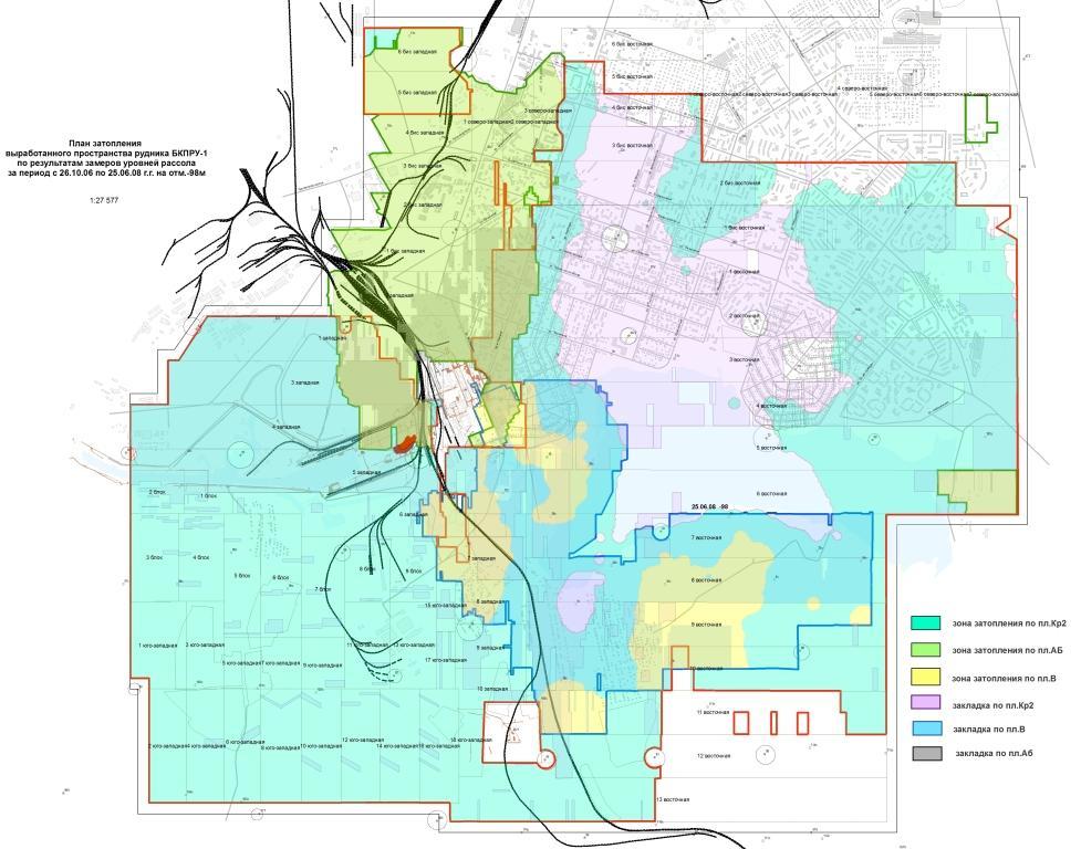 Годовые скорости оседания за период 04.2007-12.2007г.г. составляли 10-75мм/год. Очередные наблюдения выполнены 10.04.2008г. Годовые скорости оседания стенных реперов на домах в пределах от площади Решетова до улицы Челюскинцев за период с 19.12.2007г. по 10.04.2008г. возросли до 200мм/год. Выработки по обоим пластам Кр2 и АБ затоплены.