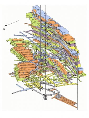 Насколько я помню, разные цвета выработок относятся к разным горизонтам, а вот какой цвет к какому горизонту, тут не мне судить. Хотя мне кажется, что вы правы, если рассматривать пласты сверху вниз. Наверно серый цвет - это околоствольные выработки, под цвет самих стволов, а рыжие - транспортный горизонт (конвейера). Цвета радуги на 4-ом рисунке - это срез пластов под углом, рисунок просто приведен для наглядности. В принципе можно создавать любые разрезы по геологии или по выработкам под любыми углами. Когда-то Salter об этом мечтал. Что такое Биг Бен по центру не знаю, может быть какая-то пометка? А может стволы сливаются, ведь на этом рисунке изображен весь рудник (примерно 10 км х 10 км). Цвет значения не имеет, можно менять раскраску, если хочется что-то выделить. То, что у Красноштейна всё понятно, совсем не значит, что у него всё правильно. Выложенные мною рисунки наглядно показывают, что рудник - это сложная связанная трехмерная система, а не простая поверхность. Поднимите мои прошлые посты и прочитайте, что я писал раньше. Кстати, опять же насколько я помню, данная модель может показывать время затопления каждой выработки при определенном притоке, а также примерное место образования газовоздушных пузырей. Более того, модель затопления можно калибровать по мере поступления новых данных. Точно также по поводу привязки к местности. Её можно привязать или по стволам, или по планам горных работ или по разведочным скважинам, указанным на рисунке 2. Было бы желание. Была бы у меня эта модель, и знал бы я как с ней работать, то понастроил бы вам много чего в ясном и понятном формате. Канадцы демонстрировали её возможности весьма наглядно. А приведенные картинки - неживые, а взяты ... ну, скажем, из презентации. ПО каким-то причинам УК выбрал плоскостную модель Красноштейна, видимо, считая, что она даёт достаточную точность. Или были другие причины...