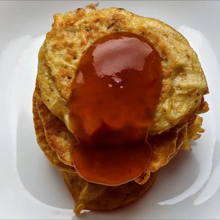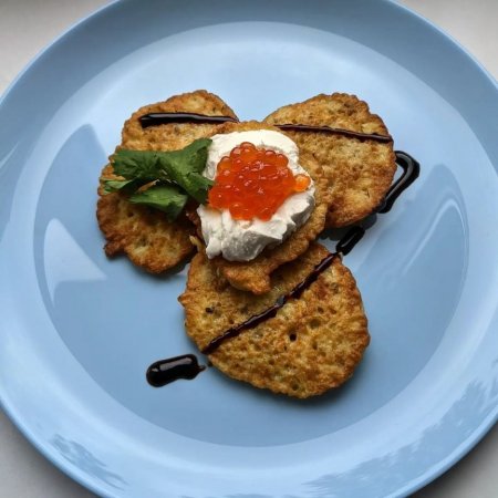 Кабачок после тёрки солю и откидываю на дуршлаг, 1-2 яйца(от размера овоща), соль, специи. Мука до консистенции оладий.