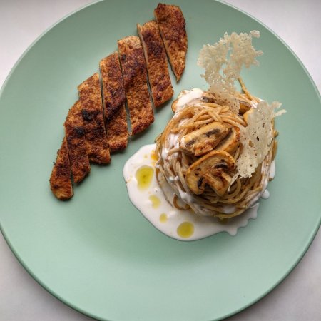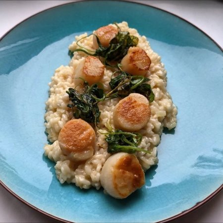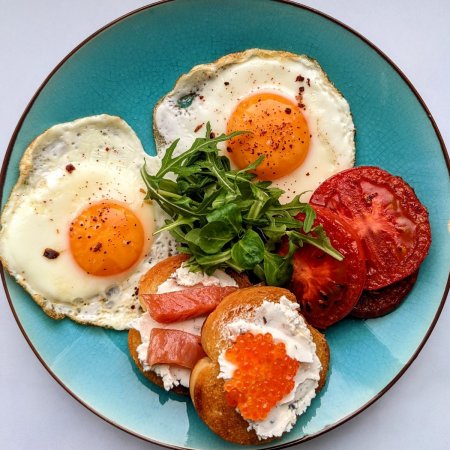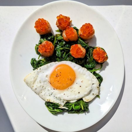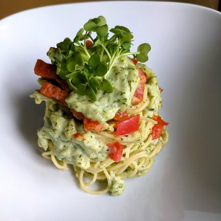 Кукумбер, адвокато, черри, сельдерей, листья маслянистого, руккола, креветосы. Заправка из заблендеренного кефира с укропом, чесноком и солью.