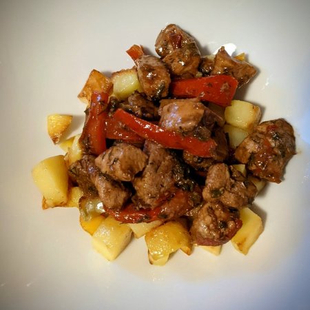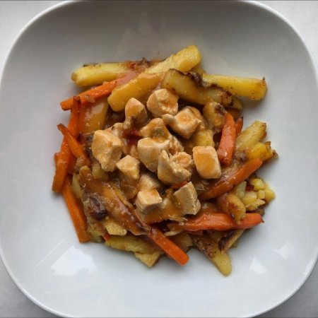 Первое жареная картошка, морковка, лук и гуляш. Второе горшки с индейкой и грибами.