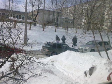 Во дворах напротив Северного чего-то непонятное. Подозреваю, что порш поцеловал ладу, но у порша видимых повреждений нет. Красная машина подъехала позже. Походу жена порша. Достали вместе пакеты с продуктами, закрыли машины и ушли. А вообще, это основной проезд к 3-м садикам, к школе №11 и многим жилым домам. Некоторые машины умудряются проезжать по тратуару, по которому туда-сюда снуют школьники.