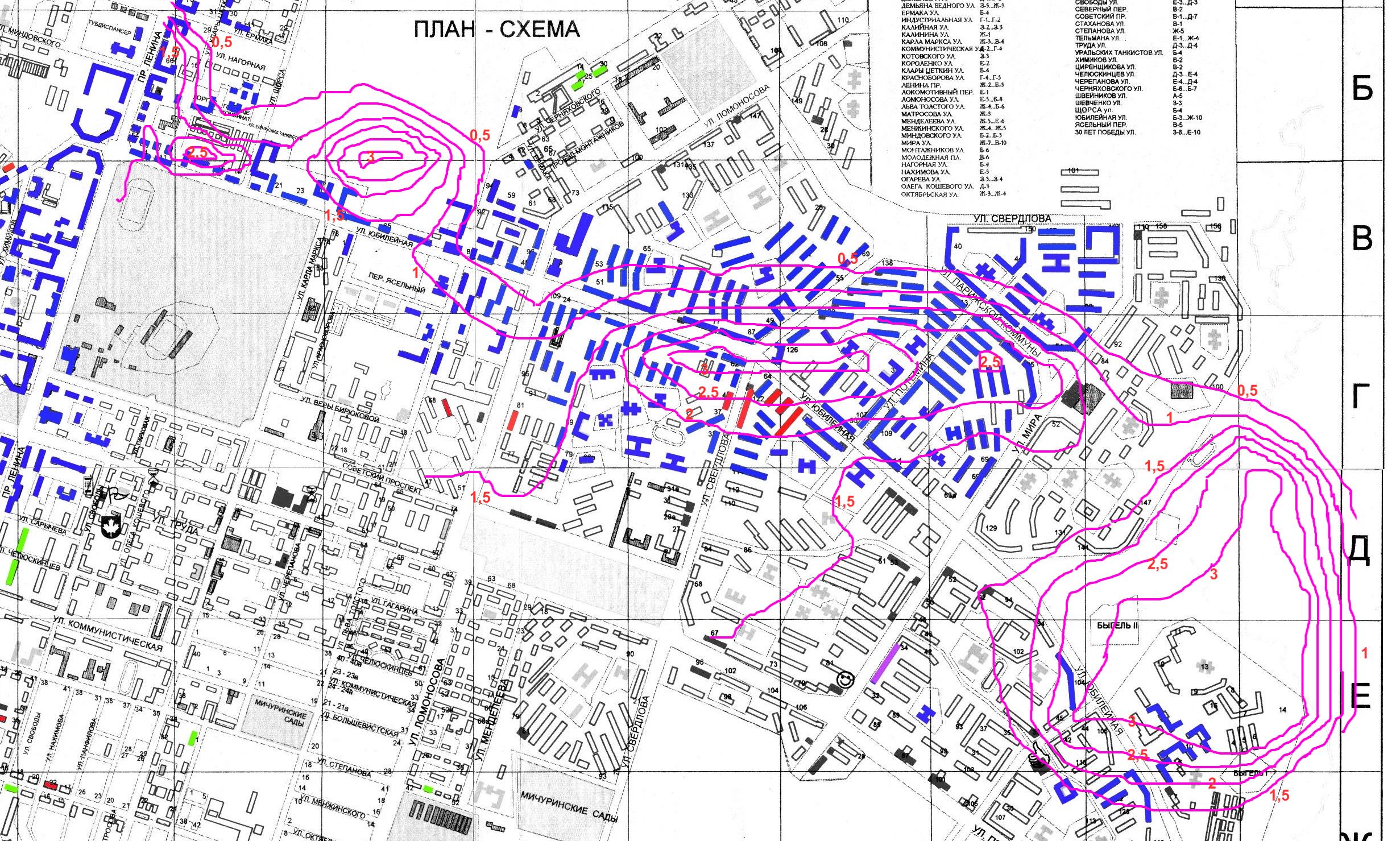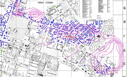Итак, гаспада! По многочисленным просьбам отдельных трудящихся славного города Березники была проделана определенная работа по совмещению вновь полученных данных - теоретического прогноза проседаний на 2056 год с уже легендарной и историческизаслуженной картой, созданной по мотивам просочившегося в массы документа со списком домов, на которые в 2006 была рассчитана стоимость переселения и сноса. Сразу скажу - не пугайтесь этой карты. Она в своем подавляющем большинстве так и осталась бредом перепугавшихся ученых какого-то НИИ после начала затопления шахты на БРУ-1. Обратите внимание на дома в центре, окрашенные красным. Это уже признанные аварийными. Я никаких выводов не делаю, так как всего лишь технический исполнитель. На карте указаны сиреневые изолинии с размерами многолетней суммы проседаний к 2056 году. Зеленые дома, попавшие на карту - это ветхие, которые поедут в Микрорайон "У погоста".