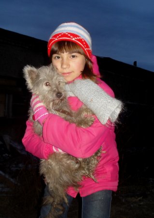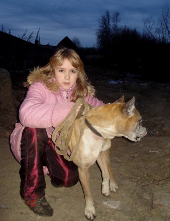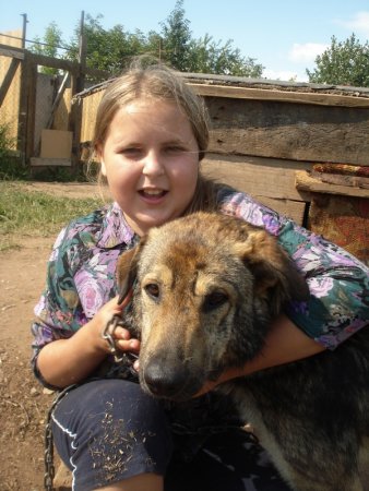 Хорошо только тем животным, которые привыкли к приюту и считают его своим домом, и не желают его покидать. Лапушка, которая сейчас живет у тебя несколько раз вывозилась, но возвращалась обратно, думала, что уж точно стала приютовской. Но она выбрала Вас с мамой, нашла свой дом, где ей уютней и приют стал ей не нужен. В домашних условиях при истинном Хозяине, песу должно доставаться больше внимания, ласки, заботы, которых мы не можем дать каждому, по причине уж очень большого количества животинок. Счастливых историй устройства наших питомцев гораздо больше :wink: Гошке не повезло, но он продолжает ждать... После возвращения Гоша на прогулках останавливается и долго смотрит вдаль...Где ты мой единственный, я так тебя жду, я так хочу, чтобы меня любили и понимали, я так хочу свой дом, мне не хочется жить в приюте....я хочу к тебе...ОТЗОВИСЬ!!! НАЙДИ МЕНЯ!!! Я тогда после Вашего ухода всех выгуляла, сначала хотела прогулять только своих подопечных, но поняла, что все хотят. Александра потом мне объяснила, что Вы не успели, так что не переживай. Сегодня опять были Александра и Ирина, выгуляли всех, кроме вольерных конечно, с некоторыми я погуляла два раза, а Гошку трижды выводила. Чувствует он себя неплохо, опухоль начинает спадать, даже на прогулке поиграл. Только вот все смотрит вдаль, раньше такого не было. Сегодня еще приходили дети, о которых хочу рассказать подробнее: Катя - давний наш посетитель. Если бы все дети были такими, очень любит животных, особенно собак. Со своей сестрой Ириной, спасли жизнь не одному собачонку и из контейнеров доставали слепых и выкармливали и на улице подбирали и травмированных. Хорошо, сейчас есть приют и им есть куда обратиться за помощью. Сейчас Катя привлекла к своим посещениям еще двух своих подружек, Юлю и Регину. Нравится, что дети вроде маленькие, но разумные, к незнакомым собакам не подходят, всегда спрашивают разрешение. У них появился свой контингент питомцев, это наши подростки: Стефани, Мишка, Роксана, Дана-Лиса и еще серенький, надо бы уточнить его кличку, а то я его называю жутко гладкошерстным, как некогда назвали на форуме. Они их долго выгуливают, играют с ними, бегают. Научили Стефани играть с палкой, уж она их сейчас так грызет, щепки летят. Выносят маленьких щеночков подышать свежим воздухом, потом выгуливают взрослых собачин, с которыми разрешаем. Это Регина с Мишкой, песа брали у нас щеночком, а сейчас уехали из города и сдали обратно в приют. А это Юля с ...тож клички не знаю...песик очень мелкий, но уже взрослый, года 3-4. Недавно прибаливал, но очень быстро пошел на поправку. Еще раз хочу поблагодарить ВСЕХ, КТО ПОМОГ НАМ ЛЕКАРСТВАМИ!!! Ну очень пригождаются!!! Если будет возможность купите пожалуйста иммунофан или риботан, в запасе есть немножко, но постоянно нужен. Остальные лекарства вроде пока есть... И еще хочу рассказать об одной девчушке, Ане - внучке нашего участника Фонда - Зои Сальбах, о которой я писала. Посещает приют два года. Ей всего 14, а она уже, как взрослый помощник и чашки моет и кормить помогает и выгуливать. Это Аня с Графом - своей любимой собакой. Граф появился у нас почти с основания приюта, привязали к воротам. Такой был несчастный, никого к себе не подпускал, потом освоился. Графу вечно доставалось от Бреда, я о нем писала: Бред был устроен в организацию, которая выехала и оставила одного в лесу, 