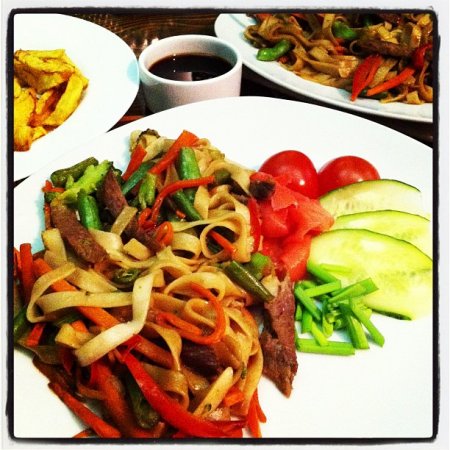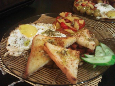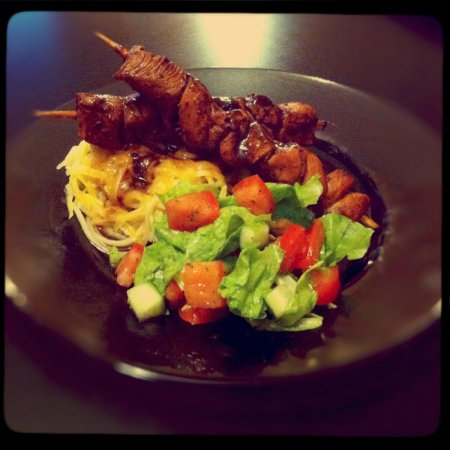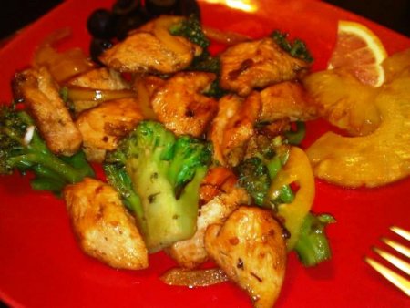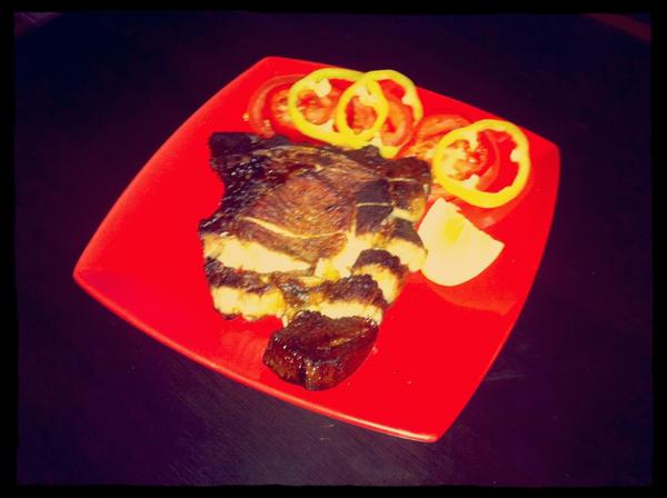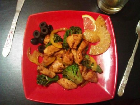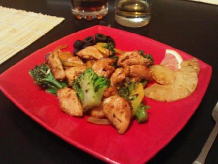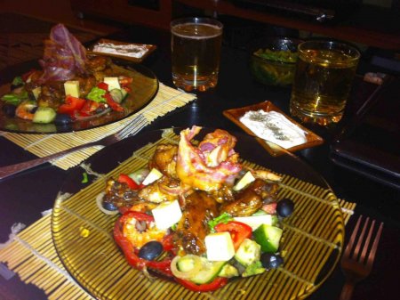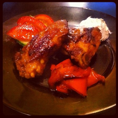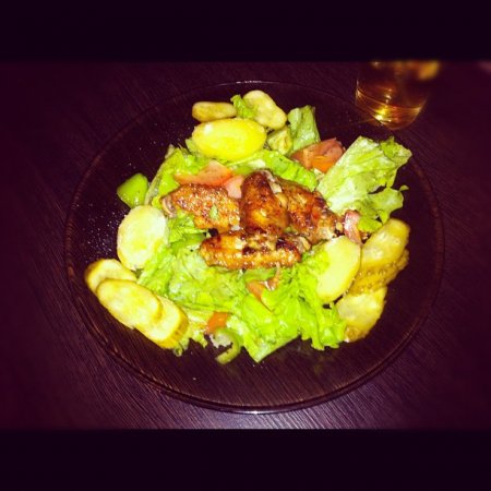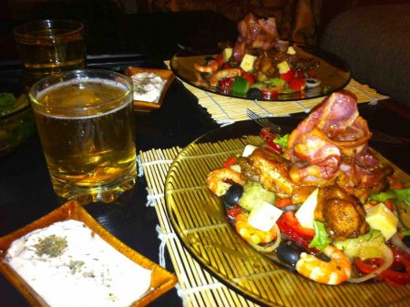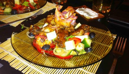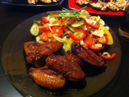 Ужин приготовили с Gerdoi, крылья маринованные в ол.масле, бальзамическом уксусе и чили и с гранатовым соусом.Салат.На закуску грудинка. Гарнир из фасоли и водорослями чука. Соус из сметаны с лимонным соком, приправа для морепродуктов, базилик,соль.