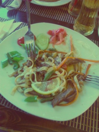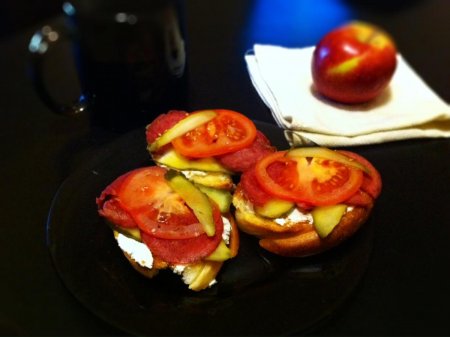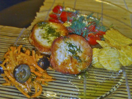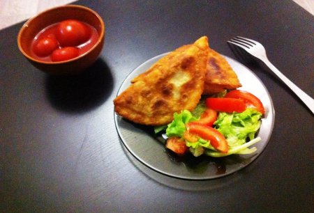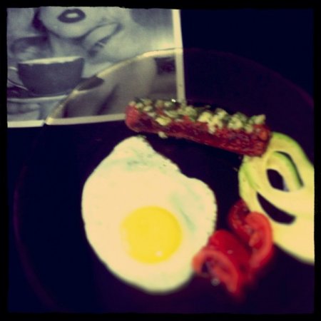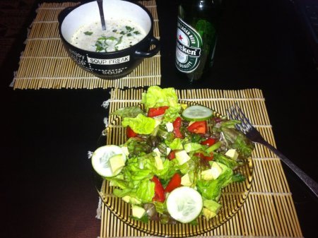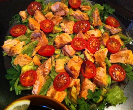 Салат с свежей форелью (листья салата, авокадо, помидоры, ол. масло, лимонный сок, бальзамический уксус) десерт (вчера почти весь латок съел)))