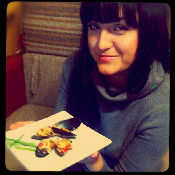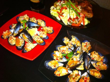 Ужин с друзьями. (мидии в сливочном соусе с перцем и шампиньонами в вине, и немного горячих крылышек маринованных в меду и много чем еще ....)))))