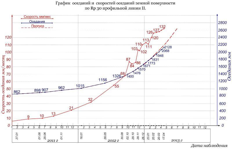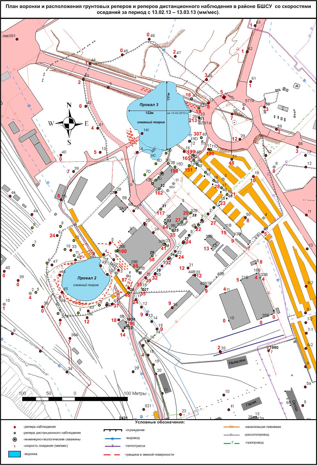 В районе опор недействующего газопровода, проходящего по территории БШСУ, скорости оседаний составили 9-35 мм/месяц, на здании РМЦ – 0-4 мм/месяц, на здании ремонтного бокса – 27-64 мм/месяц, на здании спортзала – 41-88 мм/месяц, на АБК – 162 мм/месяц, между воронкой в районе АБК БШСУ и частными гаражами – 165-307 мм/месяц, внутри автодорожного кольца – 7-12 мм/месяц.