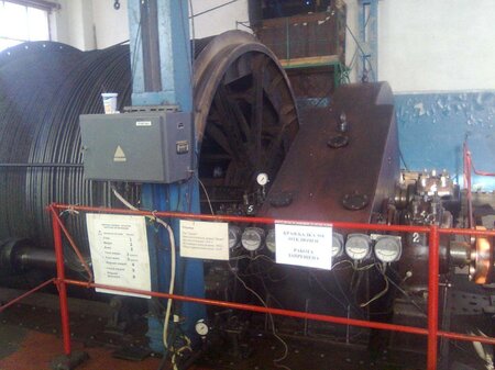 Немножко не в тему, но историческое. У нас в парке возле бассейна стоит двухбарабанная старинная подъемная машина. Это ствол 2 СКРУ-1. Она там с рождения, немка. Электродвигатель на шильдике год 1928. Фоты - как она там стояла: Там рычаги управления - чистая механика. Тетка - машинистка выглядела как гвардейский танковый мехвод