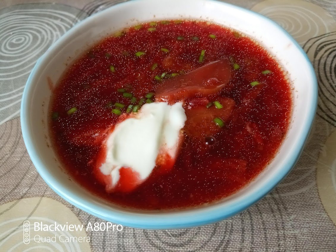Борщ с белыми грибами без мяса и совсем без зажарок и пассерования. Лук и морковь припекла на сухой сковороде и варила целиком, как с мясом.Свеклу запекла в духовке, томат пасту распустила на сковороде с грибным бульоном и подкислила огуречным рассолом. А в конце чеснок, укроп и кусок сливочного масла. Получилось очень вкусно. Еще мы печем. А мы завсегда с народом.