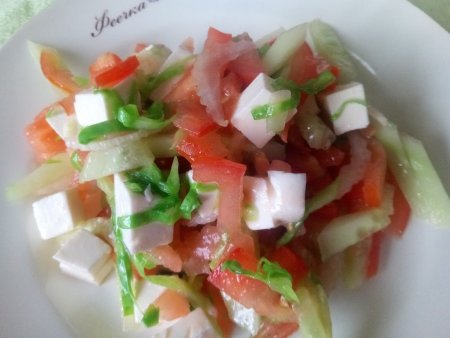 Как говорится я его слепила из того, что можно)Но все ж таки и я не совсем уж конченный диетник, ни что человеческое мне не чуждо и получился как бы "греческий" салатик. Помидорка и огурчик чищенные, вместо салата - лист молодой капусты, резаный в лапшу и заваренный кипятком, фета( положила бы в двое больше, но тогда вкус всего остального пропадает, пробовала))), заправка - масло. Лук, лимон, перец черный, маслины - нельзя! Перец болгарский вроде как можно, но я его боюсь. Если закрыть глаза и отрыв рот положить туда ложечку салата, жевнуть пару раз, чтобы во рту плотно поселился вкус свежести, размазать по небу кусочек упругого сыра и запить теплой водичкой, то чувство, что ты на морьке еще долго будет витать в твоей, обманутой иллюзией, голове.