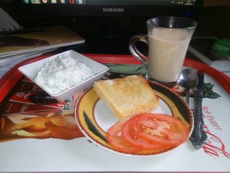 На чуть тепленький тост навалить с горочкой подсоленный творог с огурцом и укропом, да сверху помидорку и тогда жидкость с запахом кофе кажется вполне сносным завтраком.