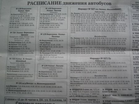 Вот маршрут 527/2у (Березники - Усолье) на выходные дни (новое расписание) Околица: 8.00, 9.00, 10.12, 11.10, 13.25, 14.00, 15.20, 16.00, 17.10, 17.50. Мясокомбинат: 8.00, 9.00, 10.00, 11.04, 12.10, 14.16, 14.55, 16.10, 17.00, 18.00, 18.40. Остановки: Околица, пл. торговая, маг. северный, маг. новинка, строит. техникум, мелодия, мемориал победы, пл. первостроителей, ЦУМ, Авангард, пл. ленина, ул. березниковская, ул. пролетарская, БСЗ, мостоотряд 59, заливы, мост, пл. елькина, маг. пятерочка (камелия), автостанция, ул. аникина, мясокомбинат.