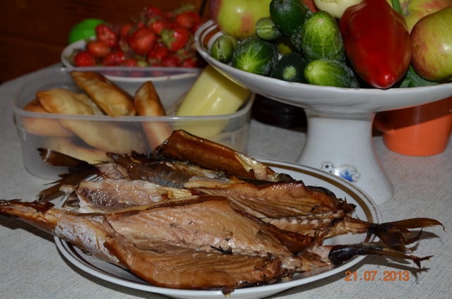 А у нас сегодня первоянварский крестьянский ужин, салаты надоели. Огурчики соленые, картошечка отварная с укропом, капустка квашеная с брусникой, утка запеченная в рукаве с яблоками. А на десерт: желе двухслойное с фруктами.