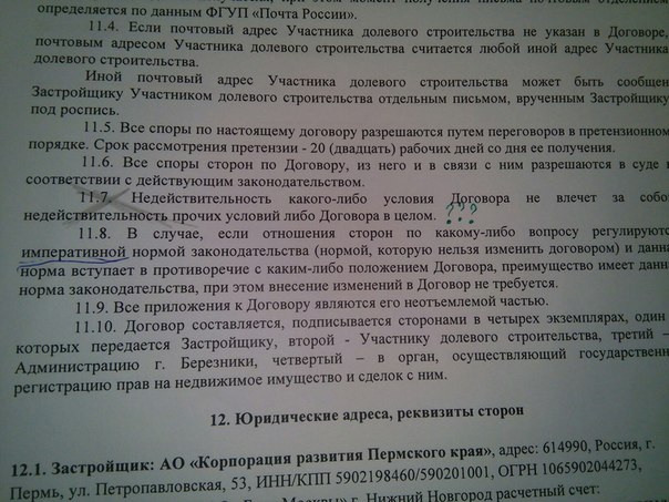 зачем в договоре указывать на то что если один из пунктов не действителен, то договор нормальный?в договоре все должно быть точно и не выполнение пунктов вообще должно говорить о том, что он не действителен а они подстраховываются на случай чего При заключении договора долевого участия необходимо, чтобы договор надлежащим образом защищал интересы дольщика. Прежде всего, в тексте договора следует обращать внимание на следующие моменты: срок окончания строительства дома; наличие соглашения сторон договора о том, что цена квартиры или квадратного метра является фиксированной и изменению не подлежит; сроки передачи пакета документов для регистрации права собственности Дольщика на построенную квартиру; сроки передачи квартиры; штрафные санкции за невыполнение данных условий договора и условия его расторжения. они в этом договоре нарушили уже 2 из обязательных пунктов, т.е. когда указали что может быть разница до 2х квадратных метров, и не указали штрафные санкции за невыполнение условий договора. Просто ввели пункт 11.7 и все