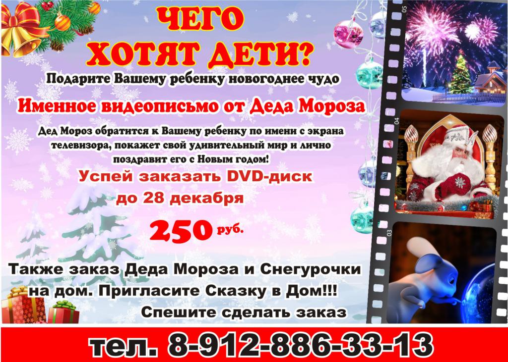 Новогоднее приключение — это именное мультипликационное видео письмо от Деда Мороза. С экрана телевизора добрый волшебник несколько раз обращается к зрителю по имени и заводит увлекательную беседу с ним, знaкомит с персонажaми и поздравляет с Новым годом. Вся сказка основана на интерактиве с ребенком, словно именно он попадает в гости к Деду Морозу и становится главным героем: отгадывает загадки, помoгаeт зажечь ёлку и многое другое.Цена видеофайла с любым именем 250руб. Успевай сделать заказ...