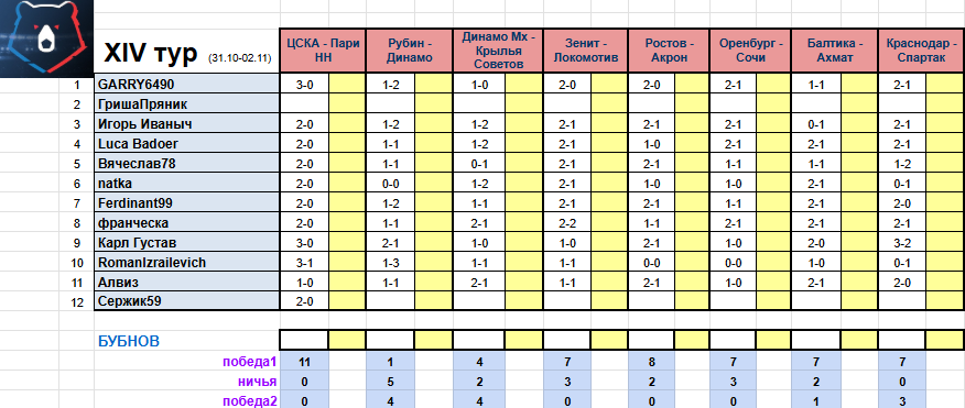 ура!!! они закончили))) а победа в туре у RomanIzrailevich! С чего мы его искренне и поздравляем!!! отличный результат, клевые прогнозы! Круто!!! 14 тур стартует 31 октября) не забывайте про прогноз! всегда ваша