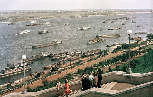 4. Трафик в 60е годы. Галоши везут) “Насыщенное судоходное движение на Волге. Нижний Новгород (Горький), вид с Верхне-Волжской набережной, 1958 г., снимок Семёна Ф…