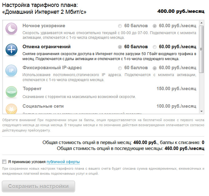 SANSAN Опубликовано 23 марта, 2013 Опубликовано 23 марта, 2013 (изменено) У меня всё получилось. Первый месяц сняли 60 рублей, со второго месяца активировались баллы (т.е. бесплатно). Возможно вы выбрали тарифный план 12 МБит/с, тогда да: будет цена 660 рублей (при том, что все опции отключены). Изменено 23 марта, 2013 пользователем SASA2504