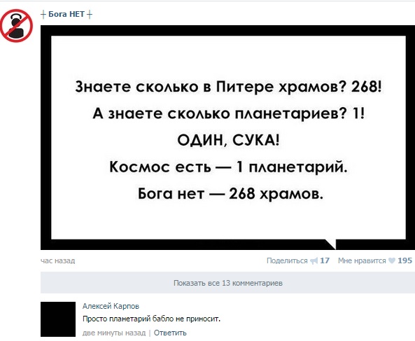 gazmaster Опубликовано 8 сентября, 2015 Опубликовано 8 сентября, 2015 Все верят в Бога. Только одни верят, что Бог есть, другие верят, что его нет. какая пошлая лингвистическая манипуляция или "игра слов" из разряда: «одни говорят, что бухать надо больше, другие говорят, что бухать надо меньше, однако обе фракции утверждают, что "бухать надо" » :lol: думаете ему не помогут безвозмездно? уверен - не то что не помогут, а ещё и выгонят с матюками :lol: Сколько ваш атеист Сталин сгноил людей в лагерях? примерно полпроцента от того, сколько сколько Торквемада сжёг на кострах. причем Сталин "самолично гноил" целых 30 лет, а вот "святоша" уложился в срок втрое меньший.