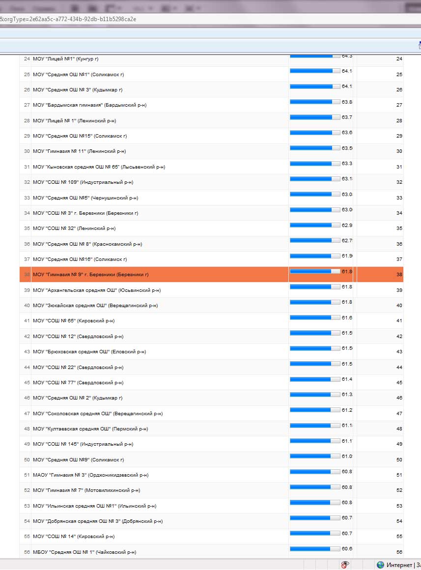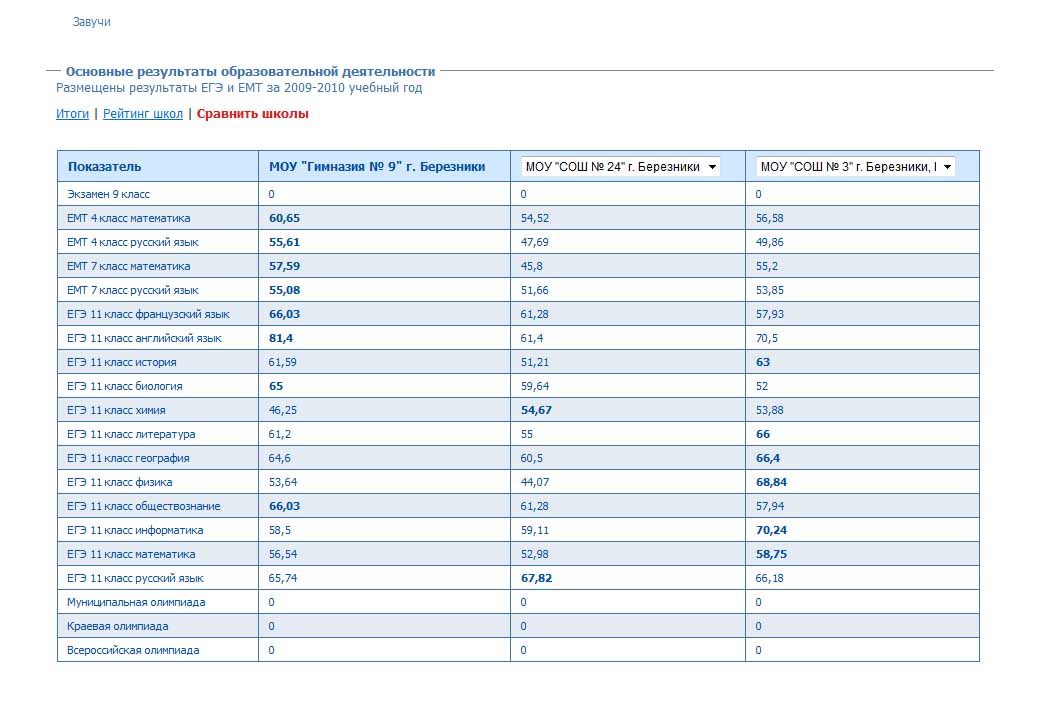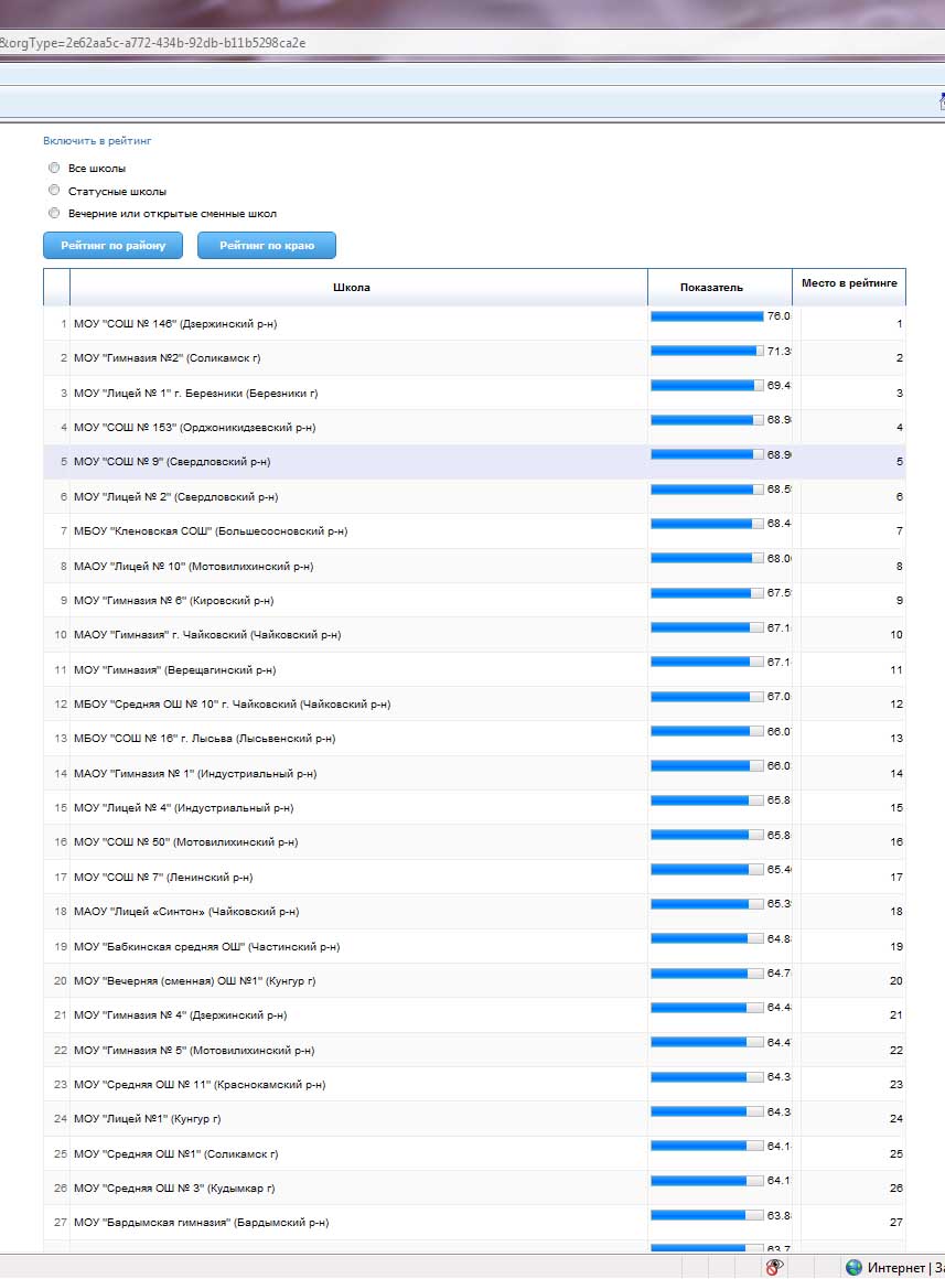 Аленький Опубликовано 26 марта, 2012 Опубликовано 26 марта, 2012 на сайте http://web2edu.ru/VisitingCard.aspx?PK={6ebe3b83-b0e2-4054-b14e-f0035604afb4}&resultType=2&orgType=2e62aa5c-a772-434b-92db-b11b5298ca2e есть рейтинг школ, причем отсортировать можно как по краю, так и по району/городу и также включить сортировку по предметам отдельно, или в целом знания.. видно что по Березникам лидирует 1лицей. он также является 3им по пермской области, 2 место - школа № 3 (по обл - 34 (из 511 заведений)), 3 - гимназия № 9 - она 38 по области можно отдельно сравнить определенные школы. здесь уже более подробно, и понятно, что по уровню образования в начальной школе - лидирует гимназия № 9 ведь самое глваное в школе - знания, их уровень, можно конечно рассуждать о качестве оценок, но если школа явно на последнем месте.. или реально в числе первых.. то уже какой перекос?? думаю, рейтингу можно доверять (в рейтинге учитывают результаты ЕГЭ и итоговые оценки годовые)