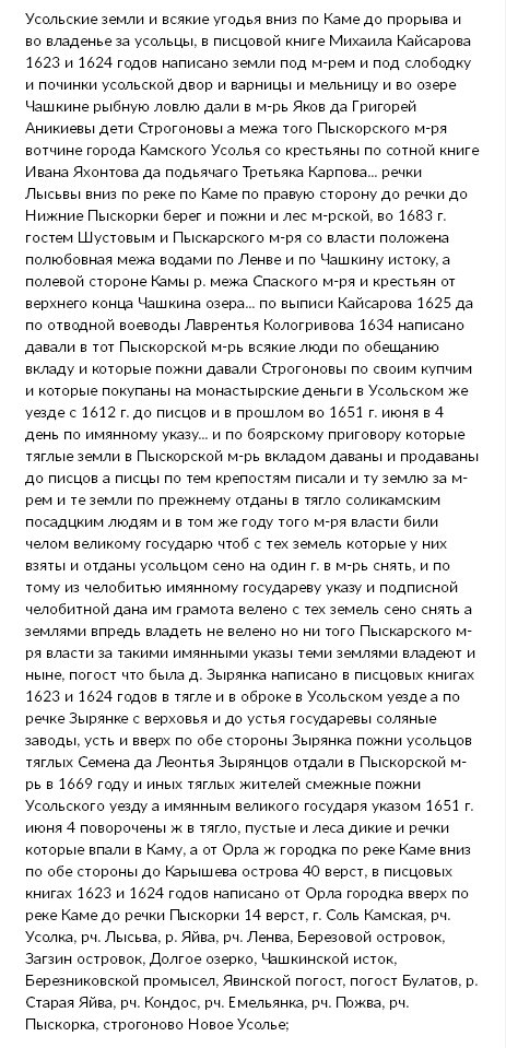 Колыван Опубликовано 6 декабря, 2018 Опубликовано 6 декабря, 2018 (изменено) В 14.02.2018 в 19:05, galina.mirtowa сказал(а) : У Мамина-Сибиряка много исторических неточностей. Так и по Побоищному острову. Вот, что пишет дедюхнский лекарь в своей книге "Горный город Дедюхин и его окрестности" (стр.3), где он анализирует спор между собой, кто основал Дедюхино: Строгановы или старцы Пыскорского монастыря? Летописец и управляющий Строгановых Волегов утверждает, ссылаясь на некую выписку из договорной записи, что "Дедюхинские соляные трубы и варницы будто построены на вотчинной земле данья (т.е. подаренныренных) гг Строгановых? Однако, утверждает Д. Петухов в свой книге "Из нее не видно, и только с натяжкой можно вывесть по ней заключение, что означенные варницы есть данье (дарение) Строгановых старцам. Если так - то когда же оне дарованы монастырю? Ни в данных записках, ни в договорной правой грамоте (** Список с нее хранится в Дедюхинских чертежах. Напечатана во Временнике, Общ. Ист. кн.18.), данной царем Алексеем Михайловичем монастырю в 1684 году не говорится о том ни слова, тогда, как в помянутой грамоте весьма определенно говорится о вранице, устроеннойц на острове Побоищном (***Побоищный остров в ободной правой грамоте под 1660 годом назван монастрыским с обозначением на нем варниц; о ныне он слился с материком и зовется Березником. На нем в 1572 году было побито дикими племенами много торговых людей), иначе Березовом, и приписанной к монастырю Никитою Строгановым в 1604 году, а в списке писцовой книги (1624/25 г.) Кайсарова, упоминается о пустой варнице на речке Пыскорке, данной Яковом." Заметьте, Петухов ссылается на исторические документы, которые он лично видел. Вопрос: откуда у Никиты Строганова очутилась варница на Березовом острове в 1604 году? Не его ли люди устроили то Побоище на Березовом острове? Варницы на Березовом острове не было . Это видно на карте ))) Березовый остров входил в , монастырские земли . Границей между монастырскими землями и Соликамскими была , река Лысьва. Изменено 6 декабря, 2018 пользователем Колыван 1