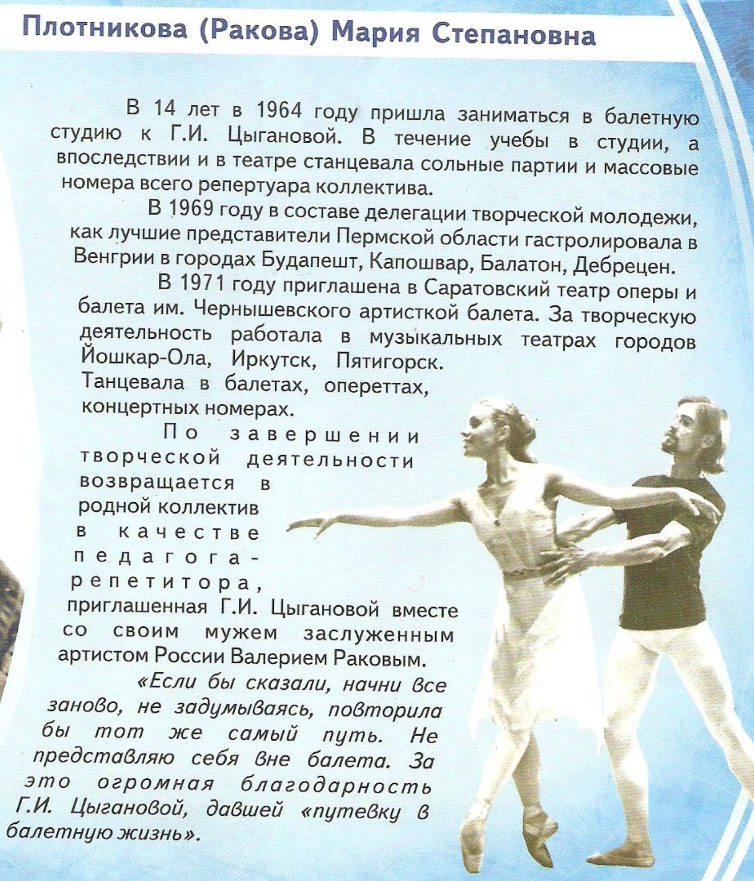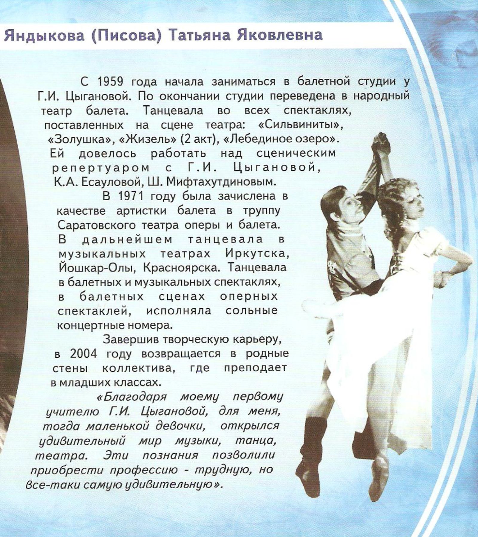 Файруза Опубликовано 22 августа, 2011 Опубликовано 22 августа, 2011 Наташа Чезганова вовремя уехала из школы-балета через пару лет ее не взяли бы в училище.Чем больше дети занимаются в школе-балета у безграмотных педагогов тем хуже для детей.Радионов АС.работает в школе-балета 6лет и не создал за это время ни одного балетного спектакля.постановки у Радионова А.С. с каждым годом все хуже и хуже, последний отчетный концерт номер "кадриль" танца нет.Участники номера занимаются классическими ,народными, современными и другими танцами по 8-9 лет, а в номере ходят пешком.2-ой номер еще хуже "гуси, мои гуси", солистка явно не хотела изображать бабусю, танца тоже не видно. Это же время в школе театр-балета работала Ольга Михайловна Худикова, благодаря её прекрасным интересным номерам дети школы театр-балета растанцевались, а времени на подготовку номеров ей отводится в 5 раз меньше чем Радионову А.С. . Ольга Михайловна Худикова действительно педагог высшей катигории, закончила Санкт-Питербургскую академию. Растанцевала многих учеников города Березнеки за годы своей работы. Я считаю , что она должна быть художественным руководителем в школе театр-балета , а у нее до сих пор нет хорошего помещения где могла бы творить свои прекрасные номера.А педагоги ,не имеющие дипломов по специальности хореографии, занимаются в больших просторных залах:Ракова М.С., Писова Т.Я., Пронина С.Е., Скаткова Е.А..