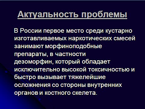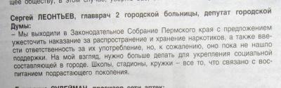 kross Опубликовано 7 сентября, 2011 Опубликовано 7 сентября, 2011 Для тех,кто не читал в "БВ". Каста ходячих трупов 24 Авг, 2011 at 4:19 PM Дезоморфин становится самым употребляемым наркотиком из-за доступности лекарственных препаратов Еще в апреле нынешнего года президент Медведев публично возмущался тем, что в розничной аптечной сети можно легко приобрести препараты, содержащие наркотические вещества, а в Интернете свободно размещаются рецепты приготовления опасного зелья. Речь шла о кодеинсодержащих препаратах. Было решено принять закон об ограничении продажи лекарственных средств, в состав которых входит кодеин. Планировалось, что с 1 мая 2011 года их можно будет купить только по рецепту, однако это решение было отложено на целый год. Пока законодатели на своем уровне просчитывают всевозможные риски, наркоманы совершенствуют свое мастерство по выделению дезоморфина из «таблеток». Убийственная смесь, получаемая в результате химической реакции, уносит жизни молодых людей работоспособного и детородного возраста. Подсев на этот наркотик, они становятся «ходячими трупами», обреченными на смерть и издающими жуткий смердящий запах. И врачи-наркологи, и представители ФСКН едины во мнении, что дезоморфин по своей популярности давно превзошел героин. По сообщению заместителя главы ФСКН Николая Карташова, за прошлый год было ликвидировано 7000 наркопритонов, из которых около 70 % оказались дезоморфиновыми. В Березниках за последние полгода сотрудники наркоконтроля выявили 8 наркопритонов и освидетельствовали 150 человек, практически все они оказались дезоморфинщиками. Многие как в силовых структурах, так и в политике склонны считать причиной отсрочки ограничения продажи кодеинсодержащих препаратов прибыль, которую они приносят аптечным сетям. Как заметил в разговоре с корреспондентом «Вечерки» Игорь Кожокару, начальник Березниковского межрайонного отдела наркоконтроля, многие наркоманы, заходя в аптеку, даже не называют лекарственные препараты, они просят «комплект». И в ответ получают таблетки и инсулиновый шприц. По информации, содержащейся так же и в Wikipedia, чиновники Министерства здравоохранения являются совладельцами крупных аптечных сетей, именно это становится причиной торможения введения новых ограничений в угоду бизнесу. Бездействие властей становится преступлением против своего же народа. Ведь настолько либерально-широкого списка безрецептурных лекарств, как в России, нет ни в одной стране мира. Доступность лекарственных средств в стране необходимо брать под контроль государства. И речь должна идти не только о кодеинсодержащих препаратах. Как выяснилось, свою адскую смесь наркоманы научились варить не только из этих препаратов, в ход идут и анальгетики и даже глазные капли. Фармакология в своем развитии шагнула так далеко, что при умелом использовании любое лекарство может стать ядом замедленного действия. Сто лет назад в аптеках свободно продавался и героин, и кокаин, но когда возникла проблема, все государства приняли ограничительные меры. К примеру, в США еще несколько лет назад нельзя было даже шприц купить без рецепта. Языком цифр За первое полугодие 2011 года сотрудники березниковского отдела наркоконтроля выявили 91 преступление, связанное с незаконным оборотом наркотиков. Из них 49 уголовных дел возбуждено по ф