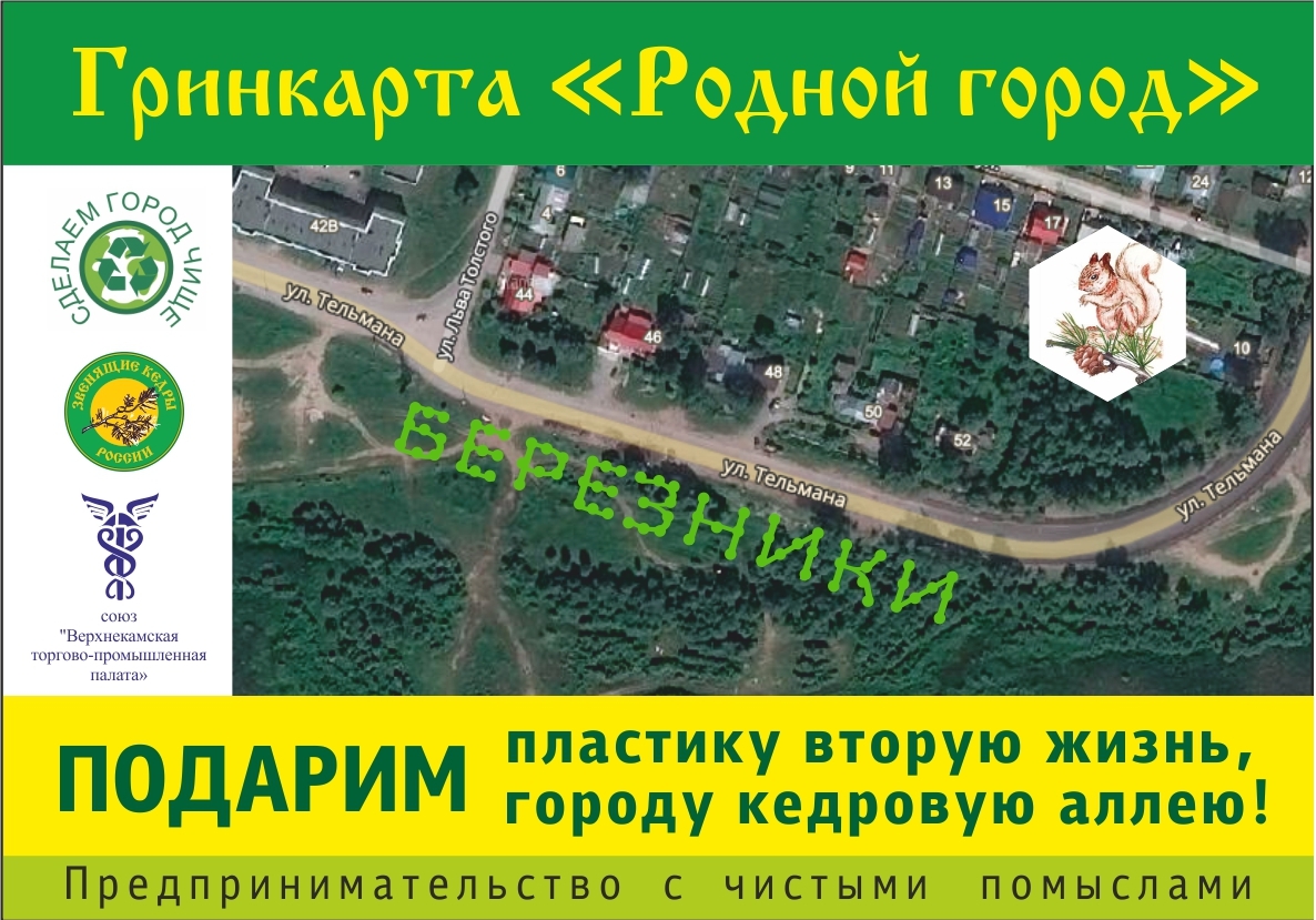 FOX Опубликовано 7 февраля, 2017 Опубликовано 7 февраля, 2017 Внимание с 6 февраля стартует экологическая акция «Пластик сдавайся»! ГРИНКАРТА «РОДНОЙ ГОРОД» В связи с объявлением 2017 года — Года экологии в России, а также в честь 85-летия города Березники Верхнекамская торгово-промышленная палата объявляет о начале акции «Пластик, сдавайся!» и выпускает гринкарты «Родной город» номиналом — 85 рублей. Цель акции: собрать и переработать 85 тонн вторсырья: ПЭТ, пластик. Сроки акции: с 1 февраля 2017г. по 31 мая 2017г. КАК ПОЛУЧИТЬ КАРТУ Условия получения гринкарты: сдать в пунктах приёма ПЭТ-бутылки, пластиковые отходы из расчёта: 10 кг пластика — 1 гринкарта «Родной город» ( из расчета за каждый килограмм пластика – 8,5 рублей). Пластик, приготовленный для сдачи, должен быть уложен в коробки, мешки (при необходимости Партнер Акции-конкурса предоставляет тару), также необходимо сполоснуть от остатков пищи, напитка, сократить до минимального объема: бутылки должны быть смяты; нельзя заполнять пластиковые бутылки другим пластиком (пакетами и т.п.); если этикетки с бутылок легко снимаются, то желательно снять. Подсчет сданного пластика будет производиться по весу в килограммах. Выезд к индивидуальным сборщикам осуществляется при сдаче не менее 50 кг пластика единовременно. При накоплении менее 50 кг сборщик организует вывоз пластика своими силами на приемочную базу Партнера Акции-конкурса по адресу г. Березники, пр. Ленина, 78 (со стороны пр. Ленина, у переезда). Партнёры акции: Верхнекамская торгово-промышленная палата, отдел по охране окружающей среды и природопользованию администрации города Березники, ООО «Гринсити», Движение «Яподарюгородукедр.ру» КАК ИСПОЛЬЗОВАТЬ КАРТУ Карту можно поменять на ЛЮБОЙ товар в торговых точках Партнеров акции «Пластик, сдавайся!» согласно номиналу гринкарты и имеющих в своём помещении соответствующие указатели Перечень партнеров Акции — предприятий и организаций представлен и пополняется в сети Интернет на сайтах : — движение «Яподарюгородукедр.ру» — Верхнекамская торгово-промышленная палата http://vktpp.ru/ или на странице в ВК Особенности Гринкарты: Гринкарты могут служить средством обмена между предпринимателями — участниками акции «Пластик, сдавайся!»; Есть уникальная возможность обменять 1 гринкарту на 1 саженец кедра в возрасте 3-5 лет (розничная цена такого саженца до 500 рублей); Принять участие в розыгрыше призов в рамках X Юбилейной выставки-ярмарки «PREZENT – 2017» , которая состоится 15 апреля 2017 года в 11.00 в банкетном зале ДК «Металлург» по адресу г. Березники, ул. Юбилейная, д. 88; Вырученные средства пойдут на благоустройство кедровой аллеи «Березники», оформление которой приурочено к 85-летию города. Верхнекамская торгово-промышленная палата http://vktpp.ru/ или на странице в ВК Движение «Яподарюгородукедр.ру» Список предприятий и организаций, где можно обменять гринкарты на товары и услуги: Магазин «Скрепка» ул. Мира 62, и ул. Юбилейная 87 Магазины Здорового питания «Лакшми» -ул. Юбилейная 129 и ул. Пятилетки 25 Чайный клуб йога-центр «ПРАНА» ул. Парижской коммуны 23 Телефонный справочник «Наш дом в краю Родном» ул. Пятилетки д. 110 оф. 410 Окна «Канструктикон» ул. Пятилетка д.32 Фото на документы «РОДНАЯ СТУДИЯ» — ул. Мира д. 62 Фотосалон «УСПЕХ» ул. Пятилетки д. 100 Школа Рока ул. Юбилейная д.58 Кофейня «КофеМЭН» ул. К. Маркса д. 48 Вопрос