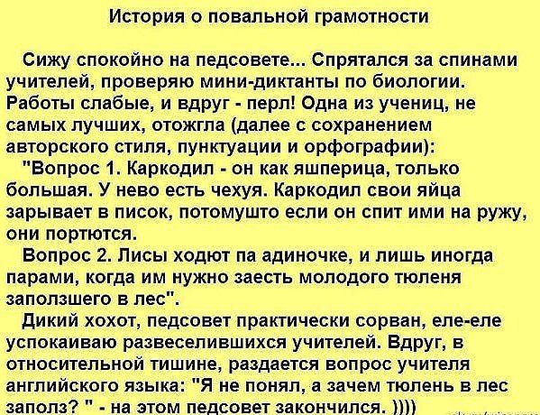 Неваляшка Опубликовано 17 марта, 2015 Опубликовано 17 марта, 2015 Школа. У девчонок 7-8 класса появилась фишка такая: у них в туалете зеркало висит. Вот эти девицы после того, как губы накрасят, зеркало целовать стали. Прикольно — отпечаток остается... А администрация подумала и решила — непорядок, антигигиена и все такое. Обычные увещевания ничего не дали, как обычно, впрочем, и тогда все те... гхм... девушки, которые находились под подозрением, были вызваны в туалет для промывки мозгов. Кроме них, там же присутствовали директриса и уборщица... ну, для примера, МарьВанна. и вот директриса начинает капать: — Одумайтесь, женщины. Неправильно поступаете (тра-ля- ля)... и в конце концов, МарьВанне очень трудно все это потом отмывать! МарьВанна, покажите, как вам трудно. МарьВанна достает свой скребок (дальше читать вдумчиво), макает его в унитаз и бодренько начинает вытирать зеркало... Как вы думаете, были ли еще после этого губки на зеркале?
