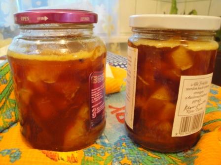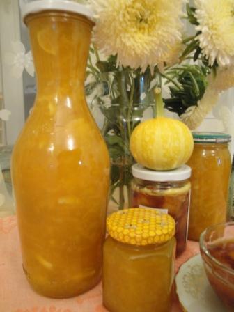 Ласка Опубликовано 27 августа, 2012 Опубликовано 27 августа, 2012 Купил сегодня апельсины и лимоны для кабачкового варенья, буду пробовать... Ну и как проба? У нас кроме кабачков ещё тыквы... У меня есть варианты рецептов с кабачком и тыквой. 1. Варенье "Лимонное солнце" Режем средними кубиками кабак и тыкву, пересыпаем сахаром (пару пригоршней) отставляем на 30-40 минут. За это время неспешно готовим лимоны, цедру на тарелочку, остальное режем на дольки. Когда кабаки и тыква пустят сок (примерно около литра) я его нещадно сливаю в миску для другого лакомства... затем в слитые кабаки досыпаем сахар и пакетик желатина сухого (я его не размачиваю). Потом всё это в мультиварку на 10 минут, либо на медленном огне вывариваем (это сложнее) у меня плита эл... Потом из мульти извлекаем кастрюлю с прозрачными дольками в сиропе, если сиропа много (по вкусу) смело увариваем до нужной консистенции. При уваривании тыква может развариться и дать пюреобразную основу, тогда варенье будет не прозрачное. За 5 минут до выключения добавляем дольки лимона. Кто любит не приторное, а горчинку-кислинку, закладываем цедру и немного ванильного сахара. Комбинации: кабак+зелёные яблоки+ лайм кабак+тыква+апелсин+корица. 2. "Божественный чатни". Сироп, что остался от сливания с кабачков ("Лимонное солнце") упариваем на с сковороде до половины. Тем временем режем на произвольные, достаточно крупные доли тыкву и нектарины (жёсткие нектарины - хороший вариант, они с тыквой не развалятся и будут иметь почти одинаковую степень приготовления) Вспоминаем детство, как делали леденцы, только не доводим до стадии пригорания сахара (когда сироп будет густым добавляем в него порошок имбиря, порошок куркумы (можно тычинки настоящего шафрана, но это дорого), гвоздику, можно немного мускатного ореха. Потом в золотой бурлящий сироп с приправами высыпаем тыкву и нектарины. Они дадут сок, варим минут 10. Добавляем ложку мёда (у меня гречишный из Башкирии) и столовую ложку подсолнечного масла. Это ОЧЕНЬ вкусно, пикантно. Чатни - афродизиак. Если хотите страсти, добавьте в сладость красный перец, будет отлично. Мужчины обычно не любят варенье, но от чатни отказаться невозможно. Свежий крепкий чай без сахара и чатни... мм-м-м-м-м. Как хранится, не знаю, не успевает. фоток много, сори...
