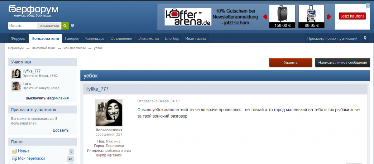 Гыгы Опубликовано 4 сентября, 2014 Опубликовано 4 сентября, 2014 Привет Вова, раз уж ты и меня пересчитал хотелось бы посмотреть на твою объективность. Смотри, вот это полный хронологический "разговор" между мной и парой пользователей которые наверняка правы, а я нет. Угу... тут все мои посты, я ничего от себя не удалил. мочить было обязательно-обязательно? голодаешь? А ты иди да поймай сам и не голодай. а что надо было отпустить?не таких не отпускают понятно, кастрюльщики... Олег забей этот гы гыеочкнь странный и зависть его скоро сожрет тк он ловит окушков не более ладошки))) вот, один придурок даже политику сюда вмешал. Евросоюз-что сказать?(чем зимой будете греться?) Народ кто то лично знаком с человеком под ником гыгы? я знаком ой ой ой, только не сдавайте меня ему, я его боюсь. хм, а интересно, а что он хочет от 14 летнего подростка? не, не сдавайте, вдруг он педофил. О_о угу, а вот тут мне в личку пришло сообщение приведённое ниже. я на него конечно-же ответил. ))) Шеняга за базар в личке ответишь ну и поехало дальше... ну и как Вова, сильно много я не прав? 1