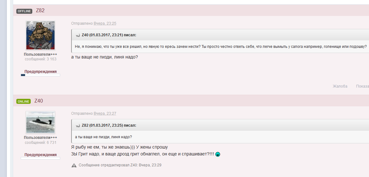 Z82 Опубликовано 2 марта, 2017 Опубликовано 2 марта, 2017 (изменено) ты, Юра, перед тем как жаловаться на не адекватные и не обоснованные действия модератора, вспомни что писал вчера а потом уже будешь носик морщить и колеса протыкать и ЧО? на личности не переходили, а просто по дружески предложил товарищу рыбку. да хоть в пж бан, ваще насрать. Изменено 2 марта, 2017 пользователем Z82