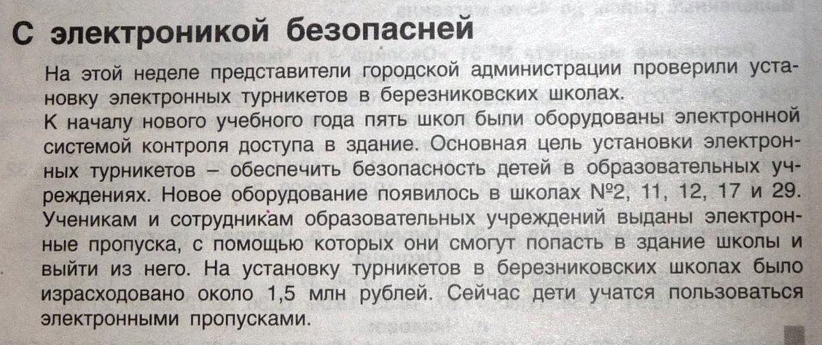 зачем-то Опубликовано 15 сентября, 2014 Опубликовано 15 сентября, 2014 Приходишь, записываешься в журнале у охранника, предъявляя при этом документ, удостоверяющий личность и вперед, - со слов завуча, еще не пробовали)) Кончено поставленные турникеты ни от кого и ни от чего не защитят, не только фойе школы из-за них стало очень тесным, но и ребенок теперь в школу пораньше уходит, что бы хоть как то успеть нормально зайти, без очереди. Система кстати работает так, что между считыванием информации с карт должно пройти примерно 10 секунд, иначе не откроется турникет, т.е. после того, как один ученик приложил карту и прошел, для второго турникет не откроется, пока 10 секунд не пройдет, и хоть "запикайся", отсюда очереди гигантские. Да, про то, что турникеты установят в нашей школе дочь говорили еще весной, т.ч. это был вопрос давно уже решенный. не далее как сегодня прошел в оттурникеченную школу без проблем ..и паспорта и вообще любой идентификации личности и записи в журнале . подскажите человечку закрепленному за работой турникета ( наверное учитель информатики или математики, как наиболее продвинутый :) ), что паузу до следующего срабатывания можно изменить в настройках до 1 секунды.